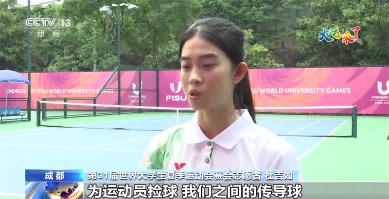 第31屆世界大學生夏季運動會賽會志愿者 杜吉如:我們是賽事志愿者,為運動員撿球,我們之間的傳導球,為運動員拿毛巾、水,還有一些擦地工作。今天是我們第一天上崗,大家也都很努力,爭取在大運會的時候服務好運動員。
