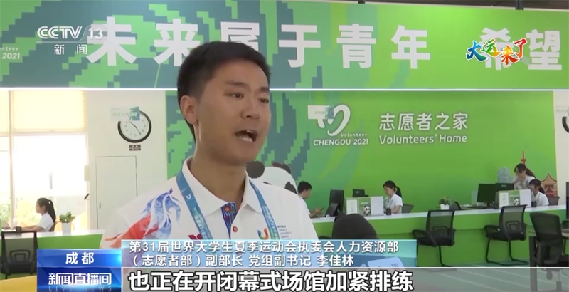 第31屆世界大學生夏季運動會執(zhí)委會人力資源部(志愿者部)副部長 黨組副書記 李佳林:最近隨著我們的世界各國代表團陸續(xù)抵達成都,我們350名代表團隨員志愿者已經(jīng)開始上崗。另外,我們有3000名左右的演職類志愿者也正在開閉幕式場館加緊排練,為他們在開閉幕式的精彩表演全力以赴。所有的競賽場館的志愿者也都已經(jīng)全部上崗,準備好迎接我們的大運會各項賽事的到來。