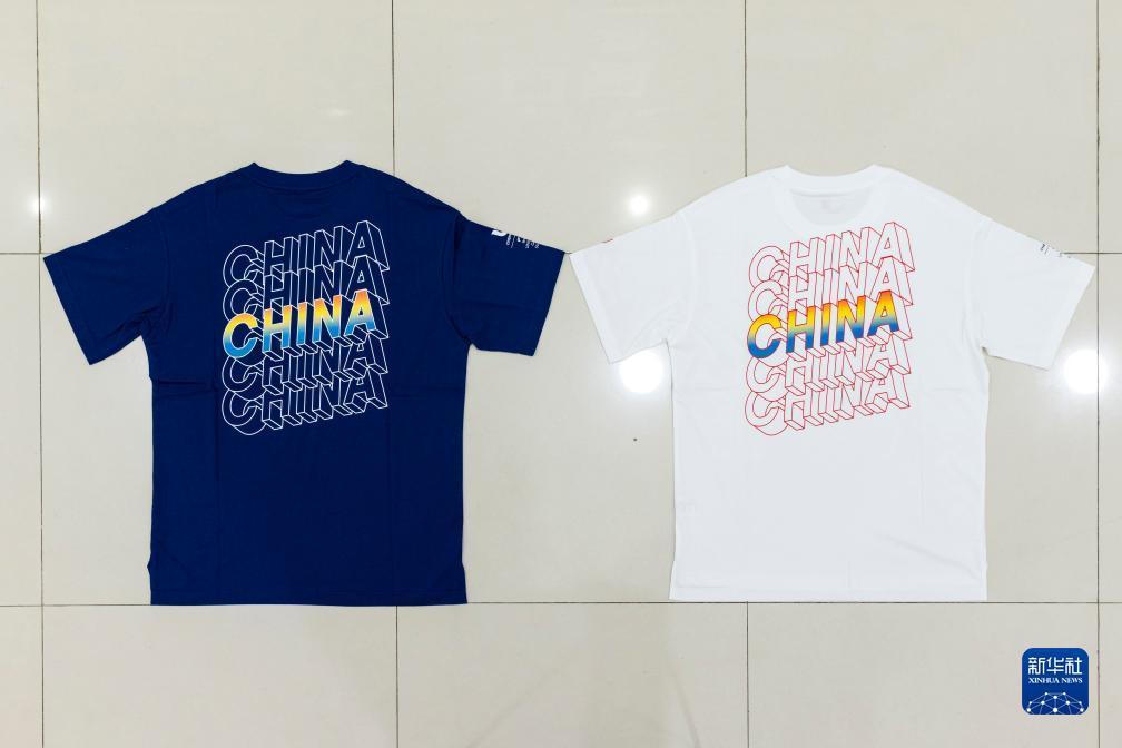 這是7月24日拍攝的第31屆世界大學生夏季運動會中國代表團成員配發(fā)裝備中的短T恤衫。新華社記者 沈伯韓 攝