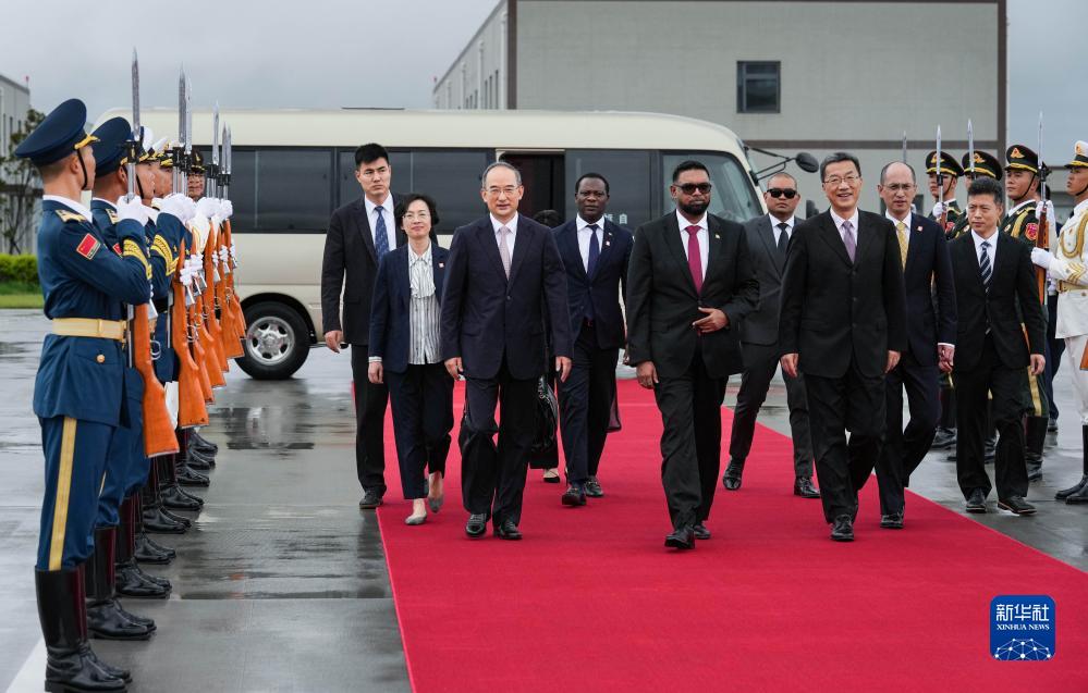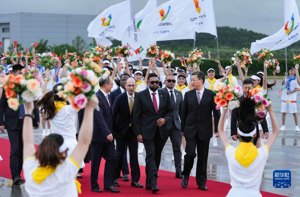 7月27日下午,來華出席成都大運(yùn)會開幕式并訪問的圭亞那總統(tǒng)阿里抵達(dá)四川省成都市。