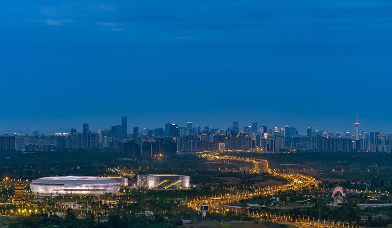 從龍泉山俯瞰夜幕下的東安湖體育公園(7月23日攝)新華社發(fā)(廖鐵軍攝)