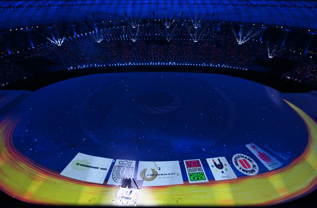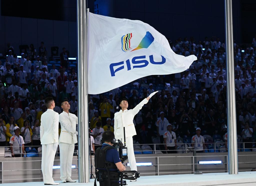 7月28日,國(guó)際大學(xué)生體育聯(lián)合會(huì)會(huì)旗在開(kāi)幕式上升起。新華社記者胥冰潔攝