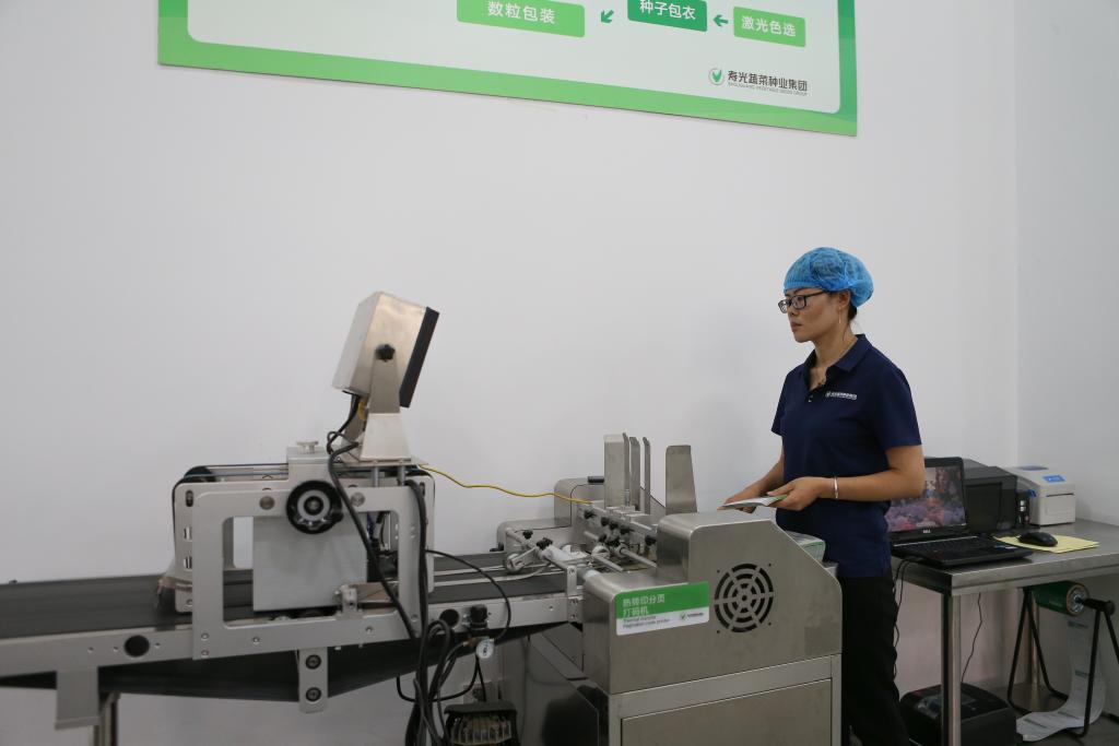 7月26日,山東壽光蔬菜種業(yè)集團(tuán)工人在包裝車間給種子包裝袋打碼。(新華社記者張浩波 攝)