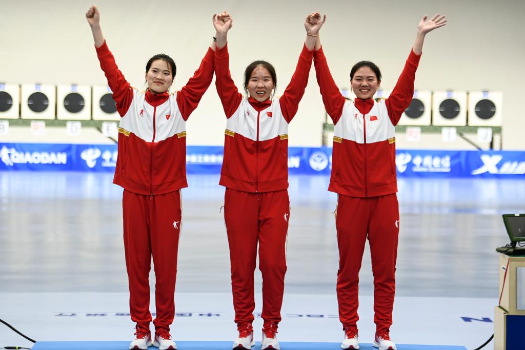 8月1日,中國隊(duì)選手熊亞瑄、林雅茜、王珂怡(從左至右)在頒獎(jiǎng)儀式上慶祝。當(dāng)日,在成都大運(yùn)會(huì)射擊女子25米手槍比賽中,她們獲得團(tuán)體冠軍。新華社記者曹祎銘攝