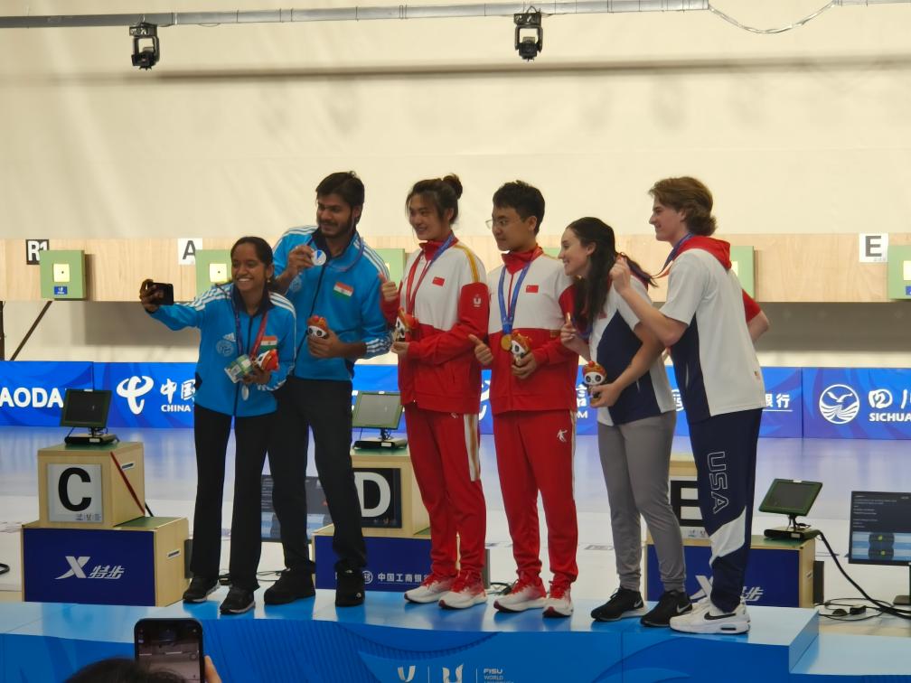 當(dāng)天,射擊賽場(chǎng)的頒獎(jiǎng)儀式現(xiàn)場(chǎng)變成了全場(chǎng)一起慶生的歡樂(lè)景象。在10米氣步槍混合團(tuán)體項(xiàng)目獲得銀牌的印度姑娘瓦拉里萬(wàn)站在領(lǐng)獎(jiǎng)臺(tái)上,在“生日快樂(lè)”的祝福聲中,伴著現(xiàn)場(chǎng)觀眾的掌聲,與一同參加頒獎(jiǎng)儀式的中國(guó)、美國(guó)選手們拍照留念。