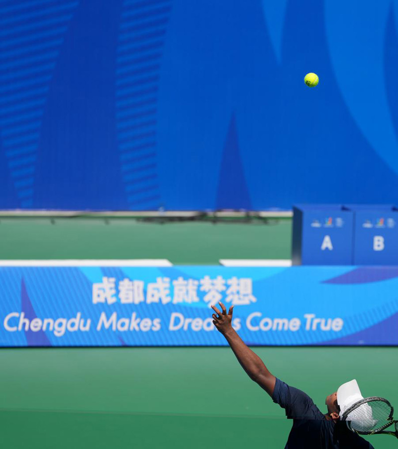 運動員在成都大運會網(wǎng)球比賽中揮拍。新華社記者 李京 攝