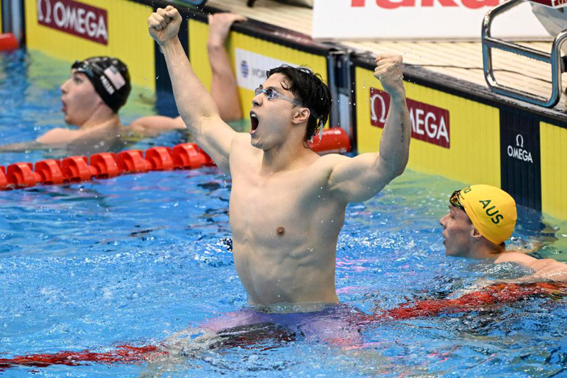 7月28日,覃海洋在決賽后慶祝。當日,在日本福岡舉行的2023年世界游泳錦標賽男子200米蛙泳決賽中,中國選手覃海洋以2分05秒48的成績奪冠,并打破該項目世界紀錄。新華社記者 許暢 攝