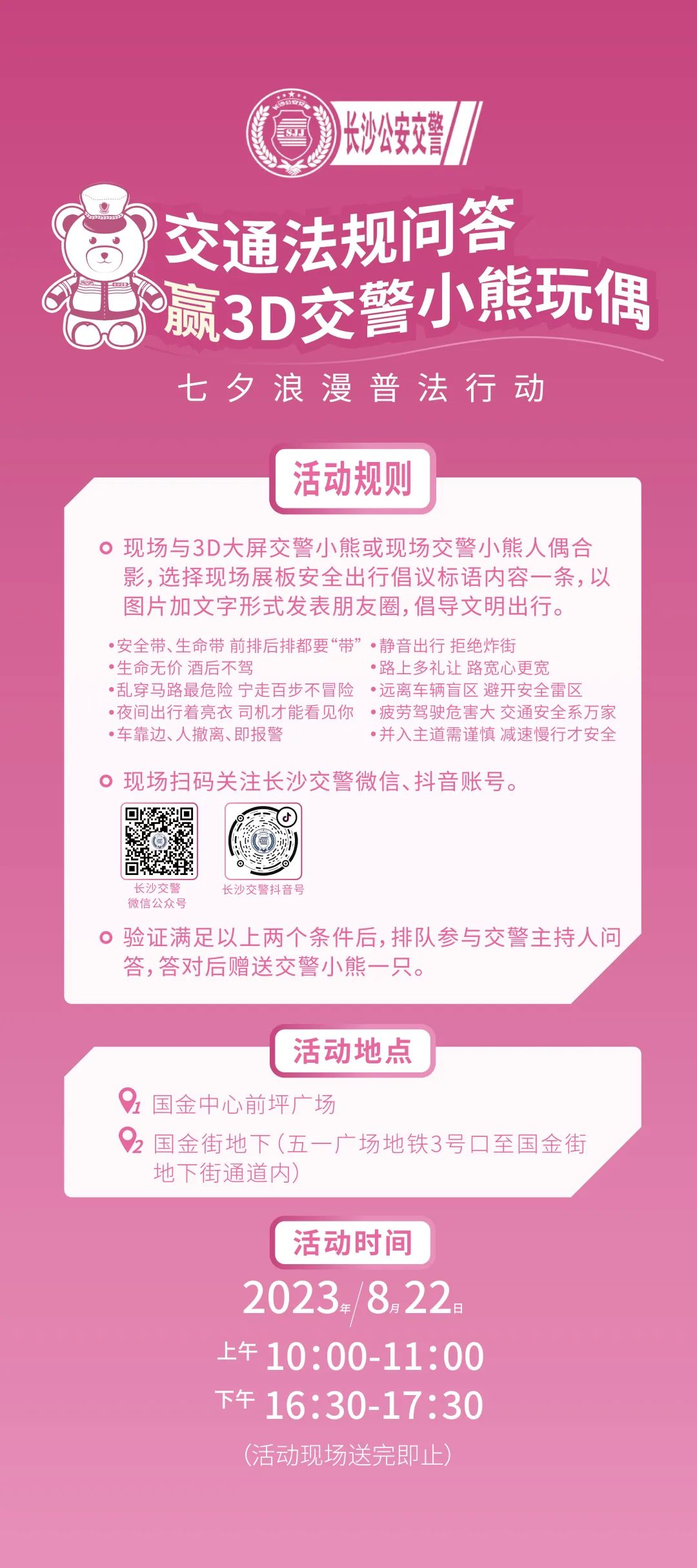 “七夕”當天(上午10:00-11:00、下午16:30-17:30),分別在國金中心前坪和國金街地下通道大屏前設置兩個普法互動打卡點,開展普法宣教互動贈送長沙交警小熊玩偶活動。現(xiàn)場民警將開展普法宣傳,邀請市民參與“交通法規(guī)問答贏交警小熊玩偶”活動, 通過答題和游戲互動可獲得“交警小熊”玩偶一只。(注意,是必得哦)
