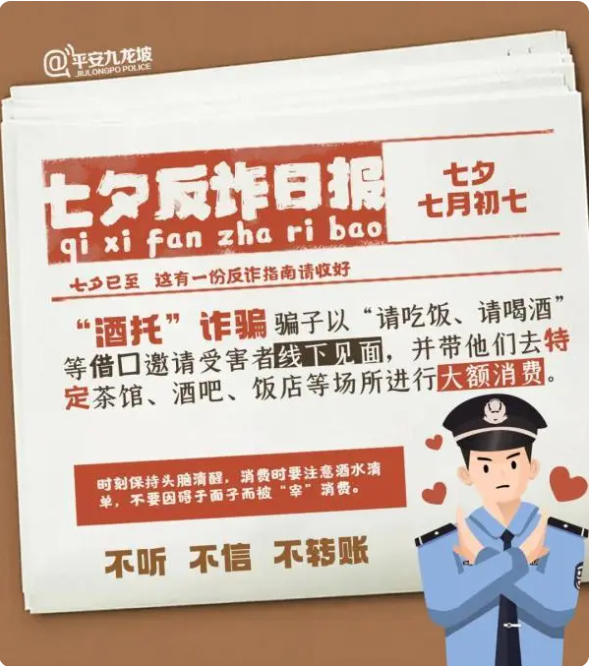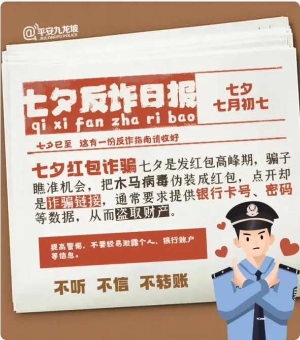 針對(duì)各類(lèi)以“七夕”為幌子的詐騙手段,重慶市公安局九龍坡區(qū)分局也精心制作了一份反詐日?qǐng)?bào),提醒廣大群眾注意防范各類(lèi)電信詐騙,勿將“七夕節(jié)”變成“七夕劫”。
