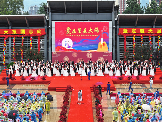 “星辰大海,夢想自有夢想的力量,仰望在銀河的想象,我們起航……”活動最后,全體新人與觀禮人員共同合唱《星辰大?!贰墼谛浅酱蠛?,新人們把愛的誓言唱響在航天大院,幸福的歌聲在青山之間久久回蕩……