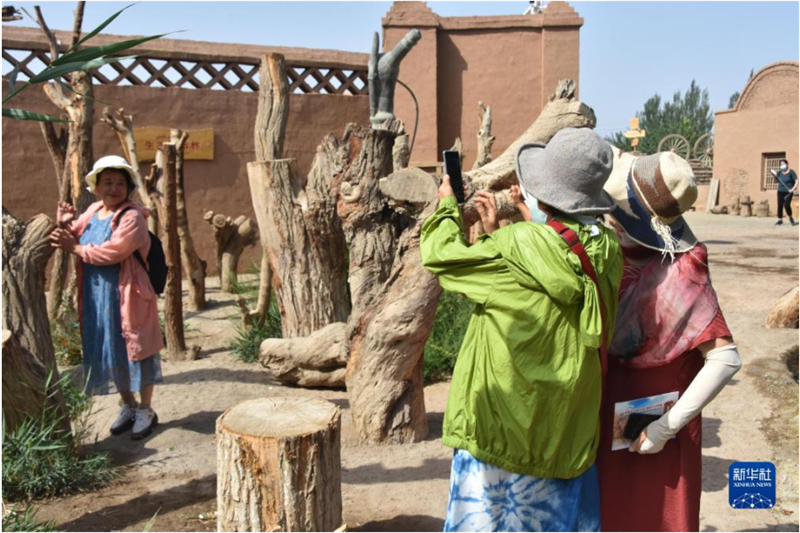 8月30日,游客在位于新疆吐魯番市的坎兒井樂園景區(qū)拍照留念。