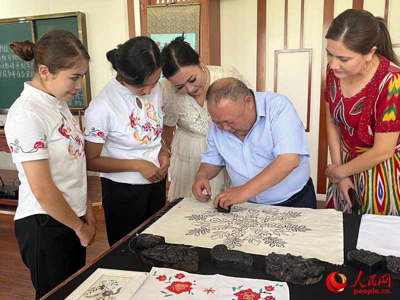 國(guó)家級(jí)非物質(zhì)文化遺產(chǎn)模戳印花布技藝傳承人吾吉阿西木·吾舒爾展示模戳印花布的制作過(guò)程。人民網(wǎng)記者 常雪梅攝
