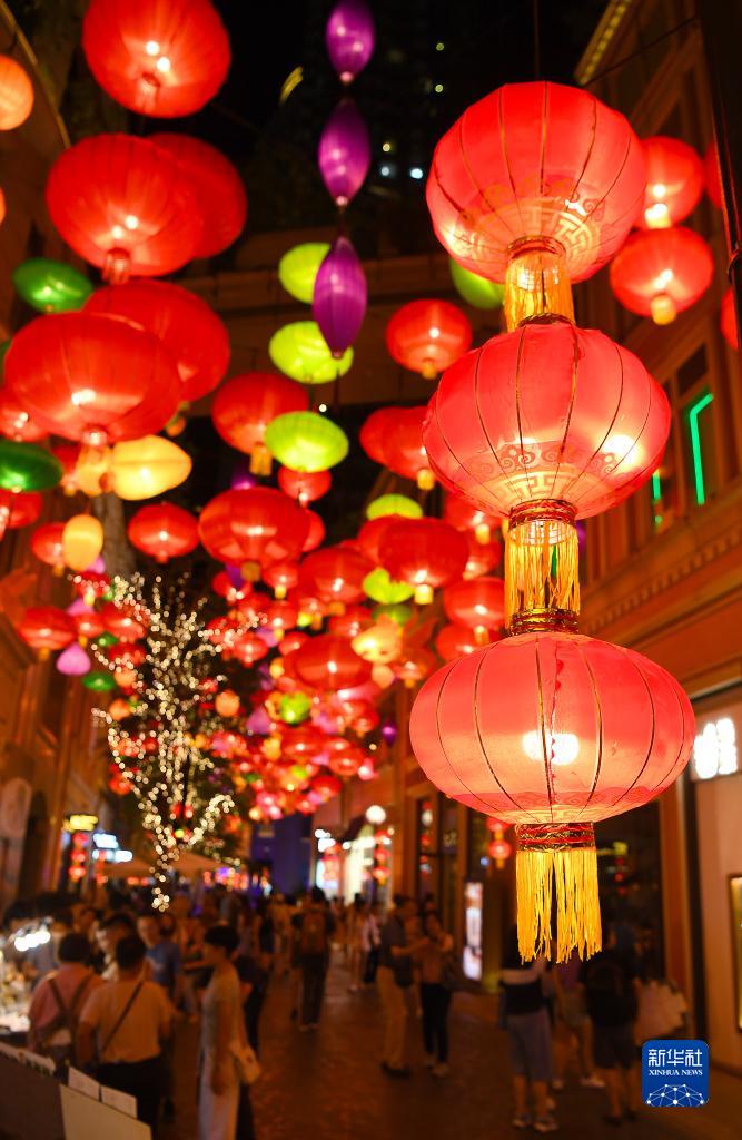 為迎接中秋佳節(jié)的到來,香港利東街舉辦“躍兔·迎月”戶外彩燈會(huì)。約200米長(zhǎng)的林蔭大道懸掛起800多個(gè)五彩繽紛的中式燈籠,營(yíng)造出喜慶的佳節(jié)氣氛。