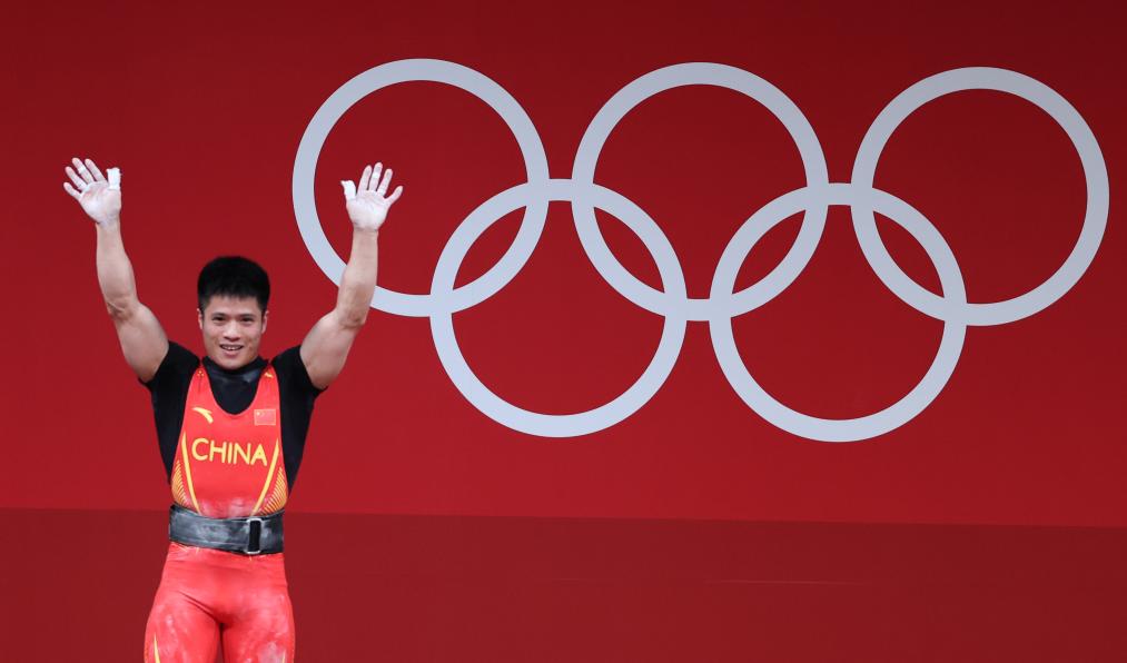 2021年7月25日,李發(fā)彬在東京奧運(yùn)會(huì)舉重男子61公斤級(jí)決賽后慶祝奪冠。新華社記者 楊磊 攝
