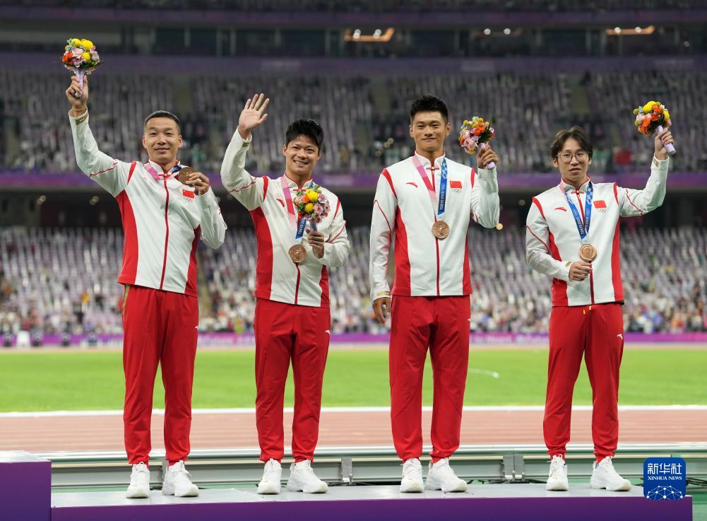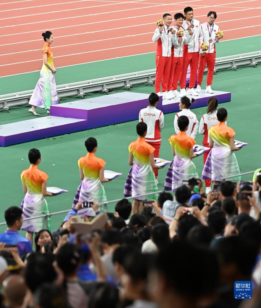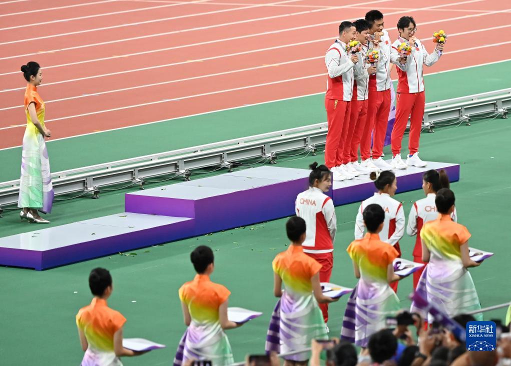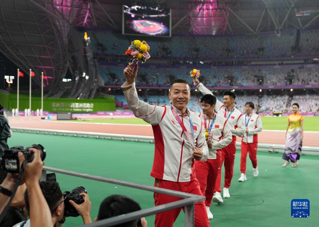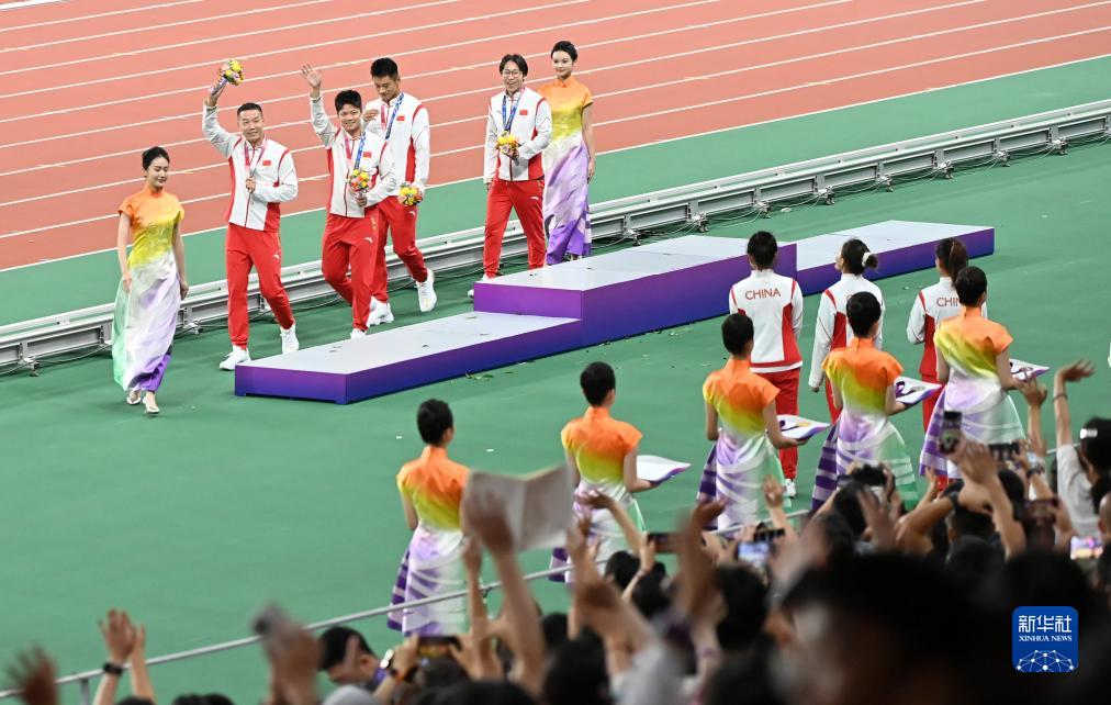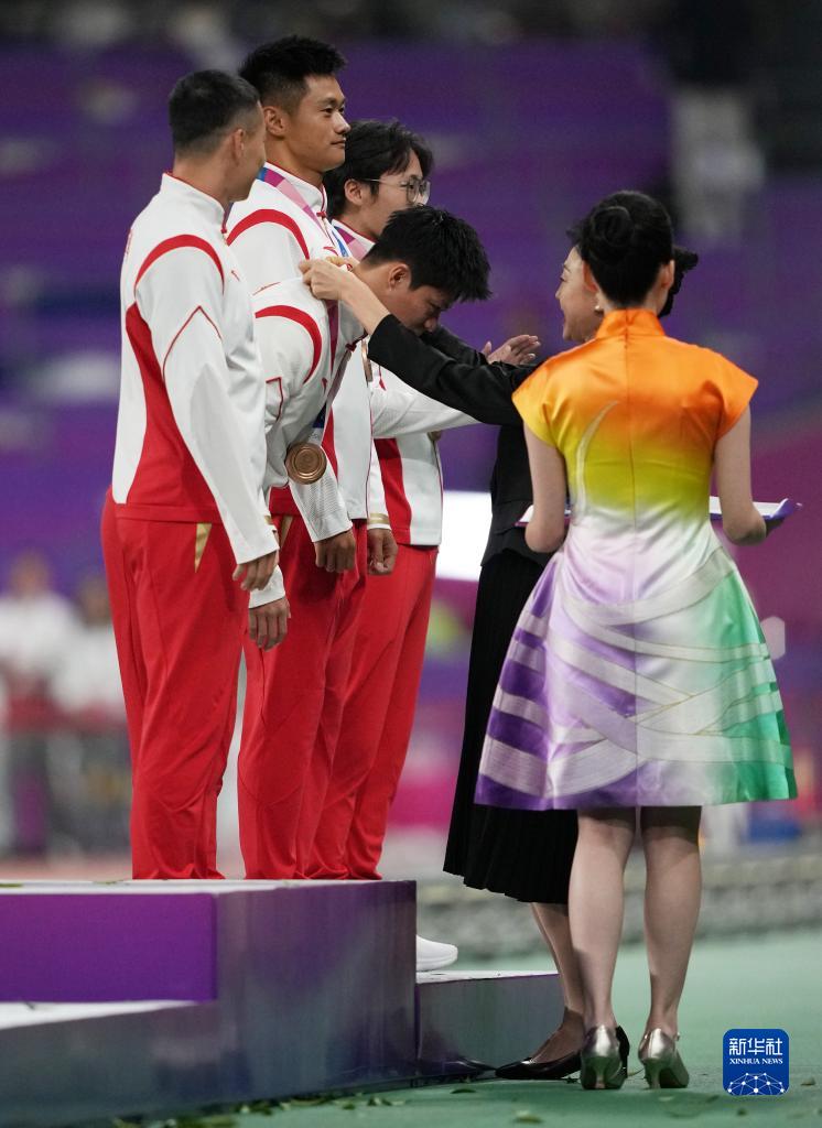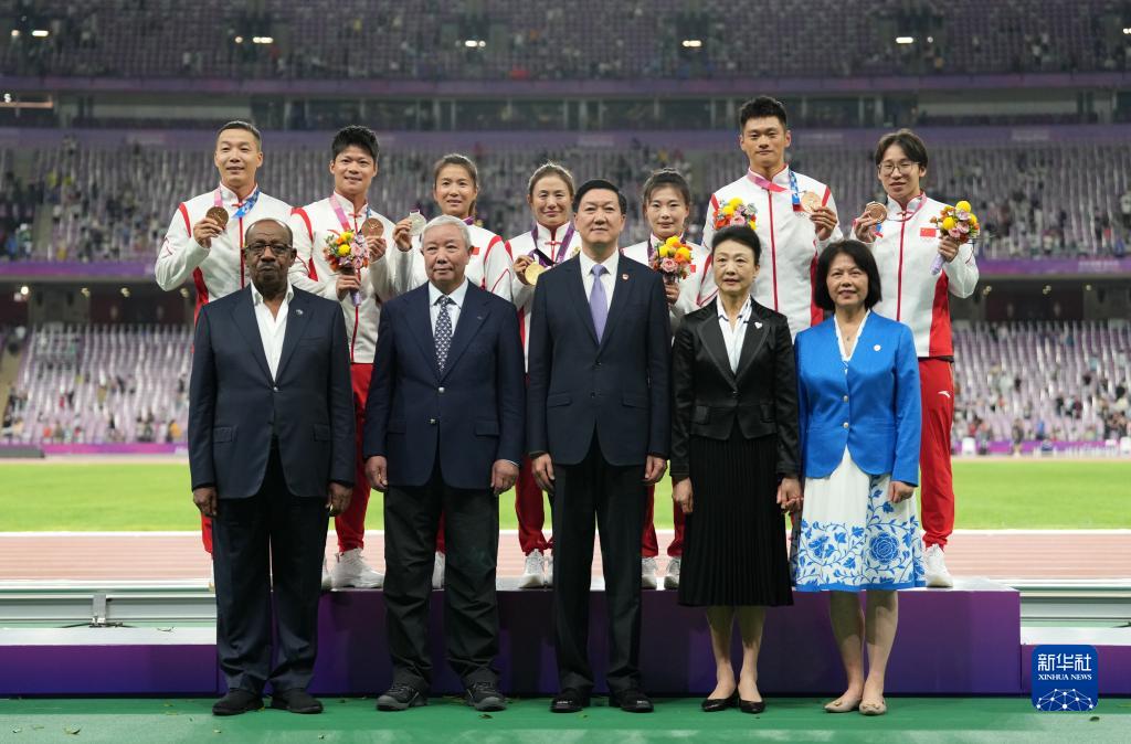 當晚,杭州亞運會田徑項目比賽結(jié)束后,中國奧委會在杭州奧體中心體育場舉行遞補奧運獎牌頒獎儀式,為遞補獲得東京奧運會男子4X100米接力銅牌的蘇炳添、謝震業(yè)、吳智強和湯星強與遞補獲得2012年倫敦奧運會女子20公里競走金、銀、銅牌的切陽什姐、劉虹、呂秀芝頒發(fā)獎牌。