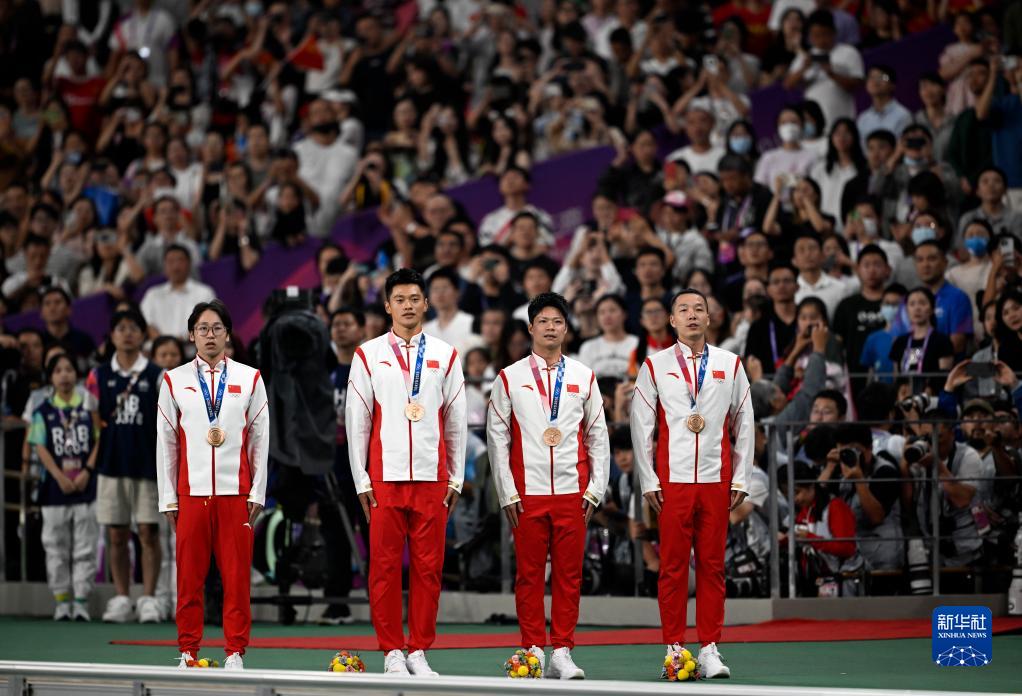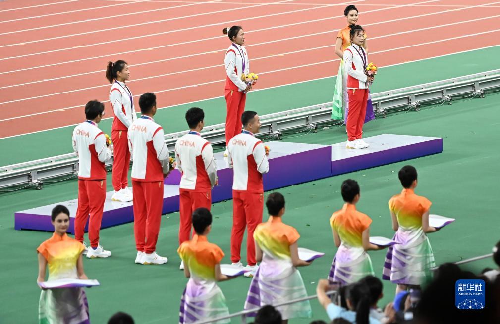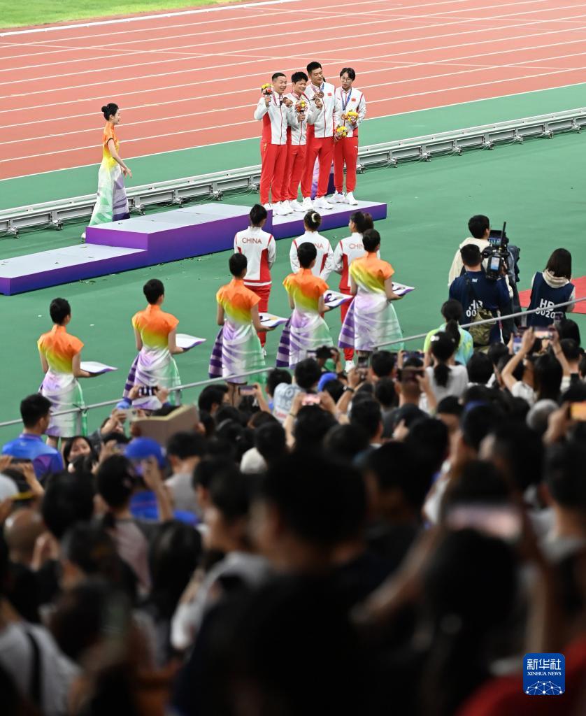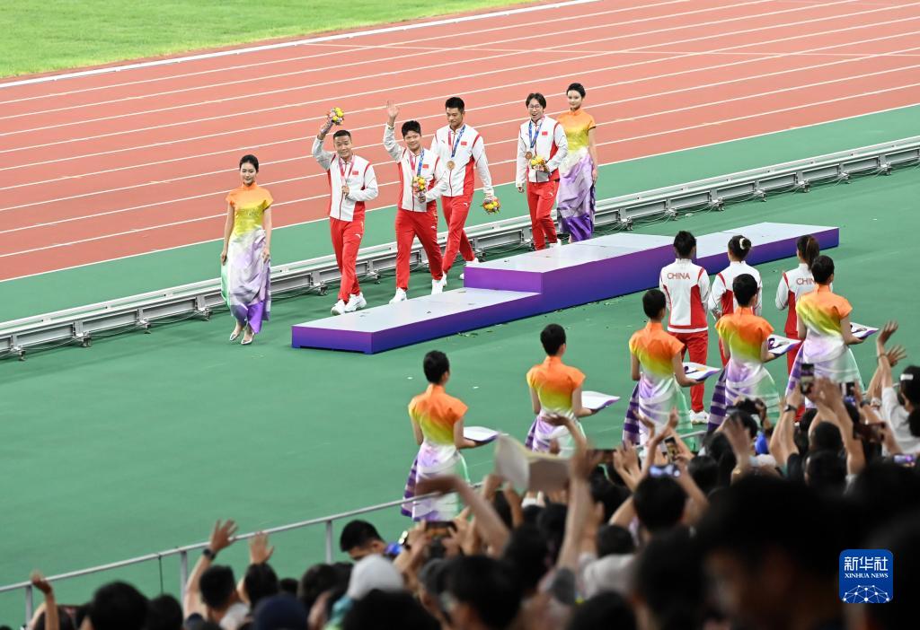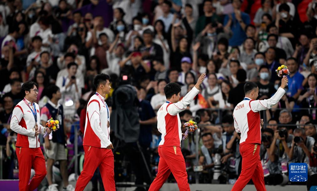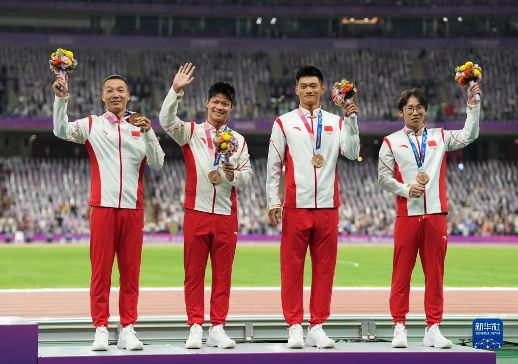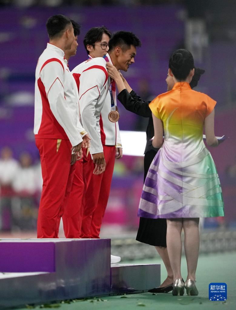 當晚,杭州亞運會田徑項目比賽結(jié)束后,中國奧委會在杭州奧體中心體育場舉行遞補奧運獎牌頒獎儀式,為遞補獲得東京奧運會男子4X100米接力銅牌的蘇炳添、謝震業(yè)、吳智強和湯星強與遞補獲得2012年倫敦奧運會女子20公里競走金、銀、銅牌的切陽什姐、劉虹、呂秀芝頒發(fā)獎牌。