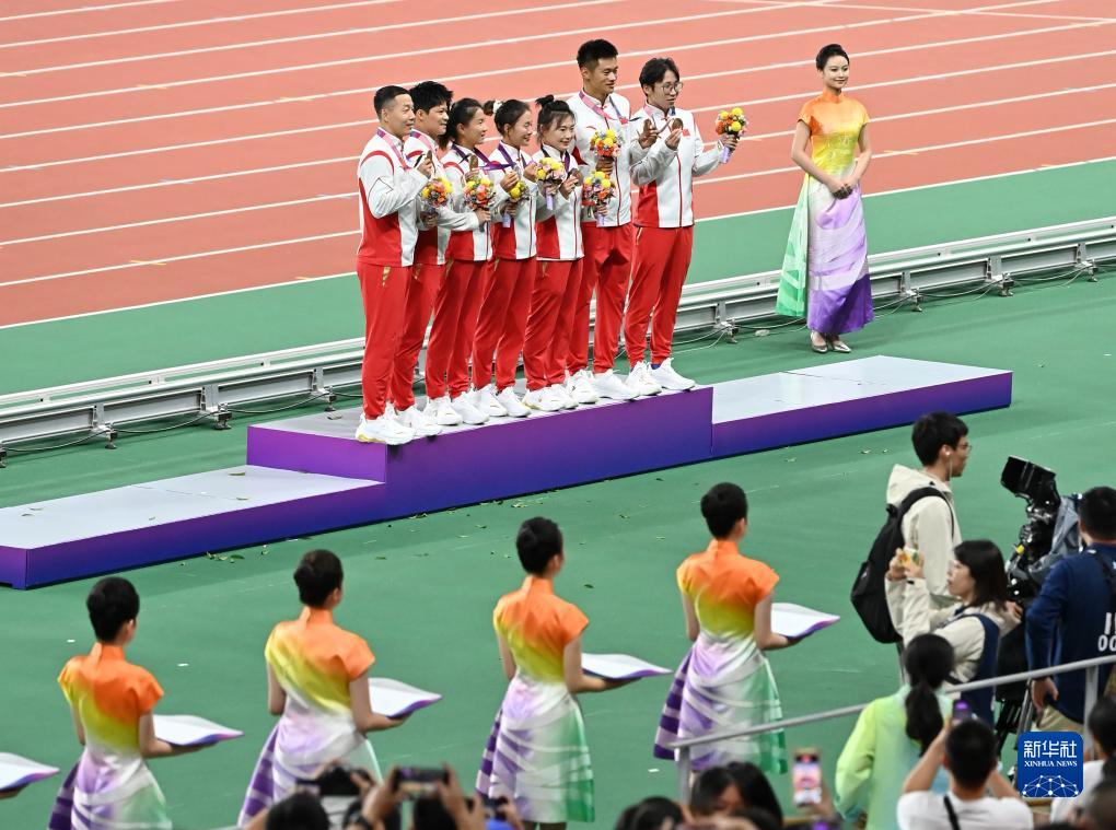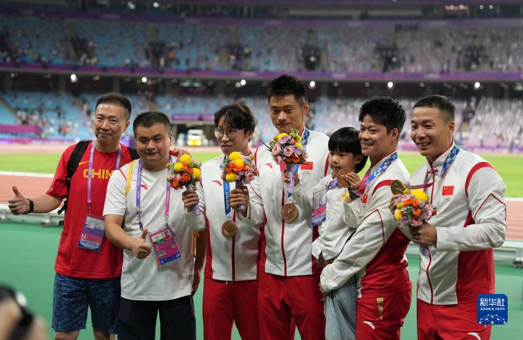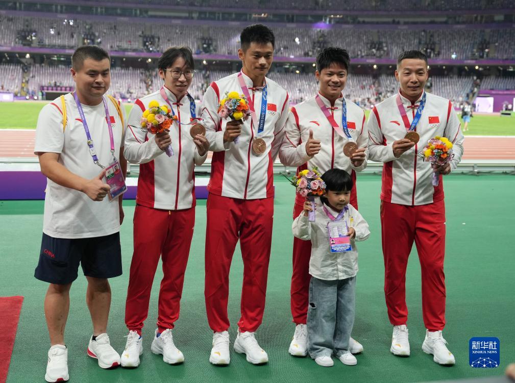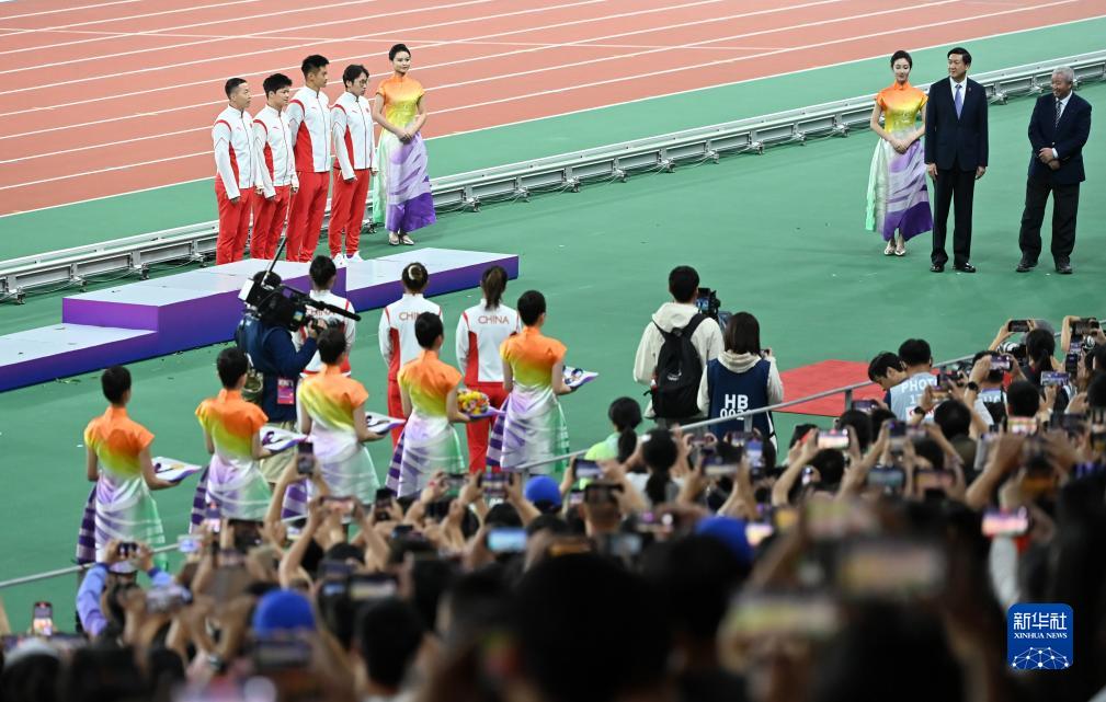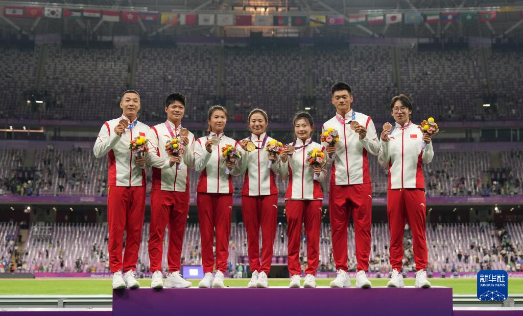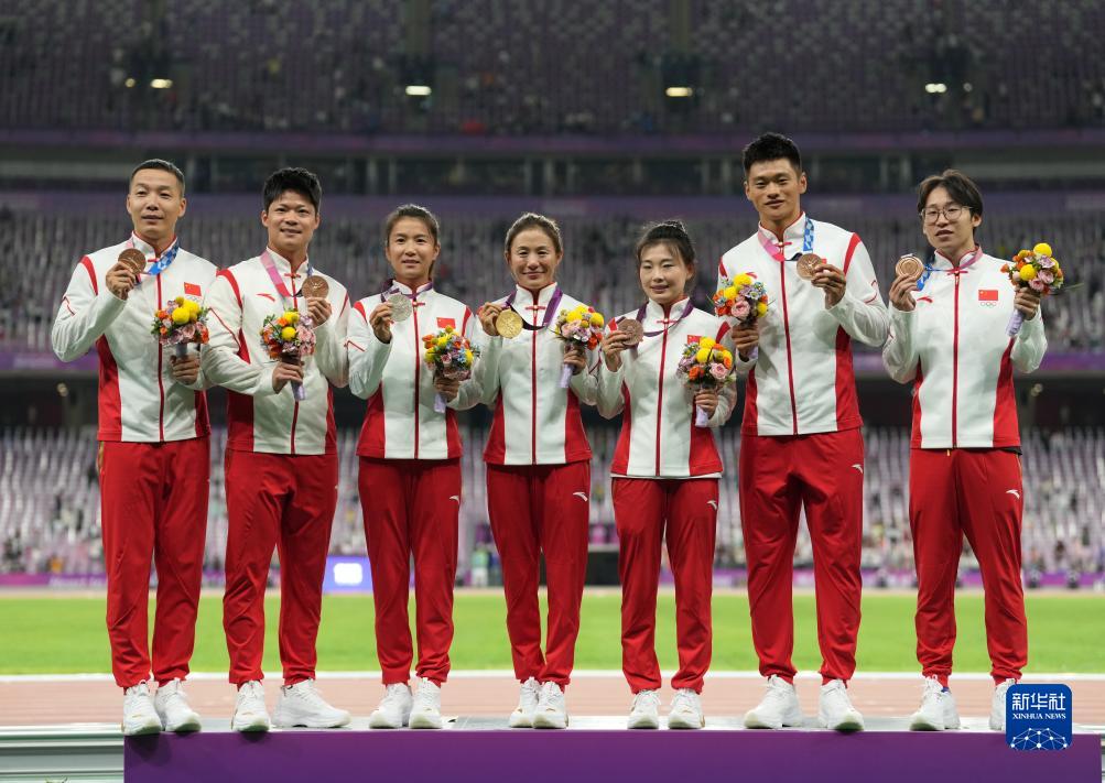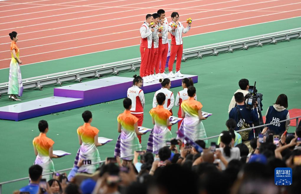 當晚,杭州亞運會田徑項目比賽結(jié)束后,中國奧委會在杭州奧體中心體育場舉行遞補奧運獎牌頒獎儀式,為遞補獲得東京奧運會男子4X100米接力銅牌的蘇炳添、謝震業(yè)、吳智強和湯星強與遞補獲得2012年倫敦奧運會女子20公里競走金、銀、銅牌的切陽什姐、劉虹、呂秀芝頒發(fā)獎牌。