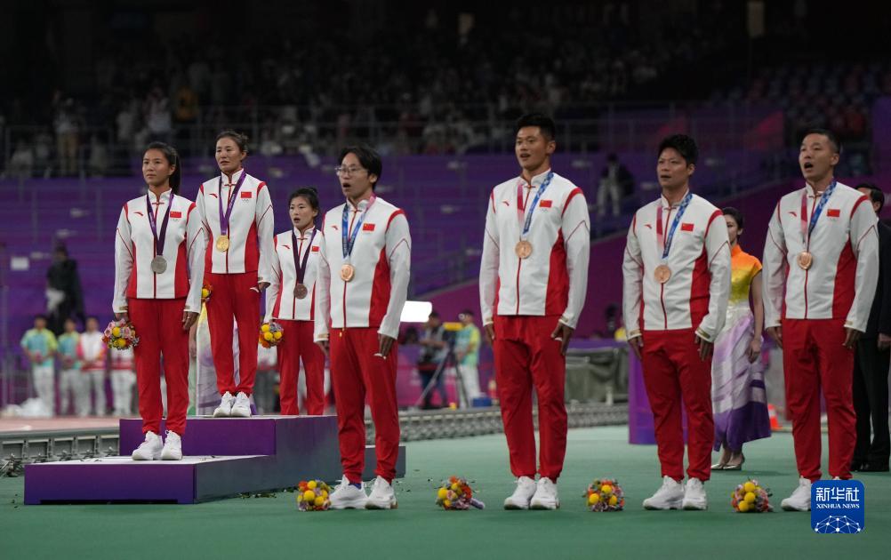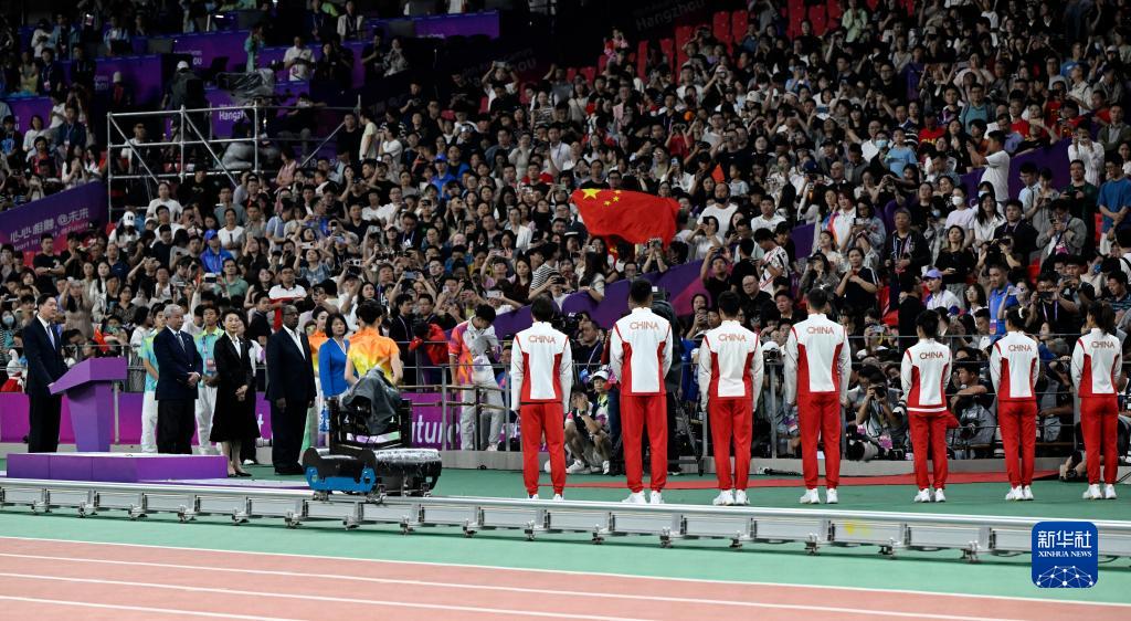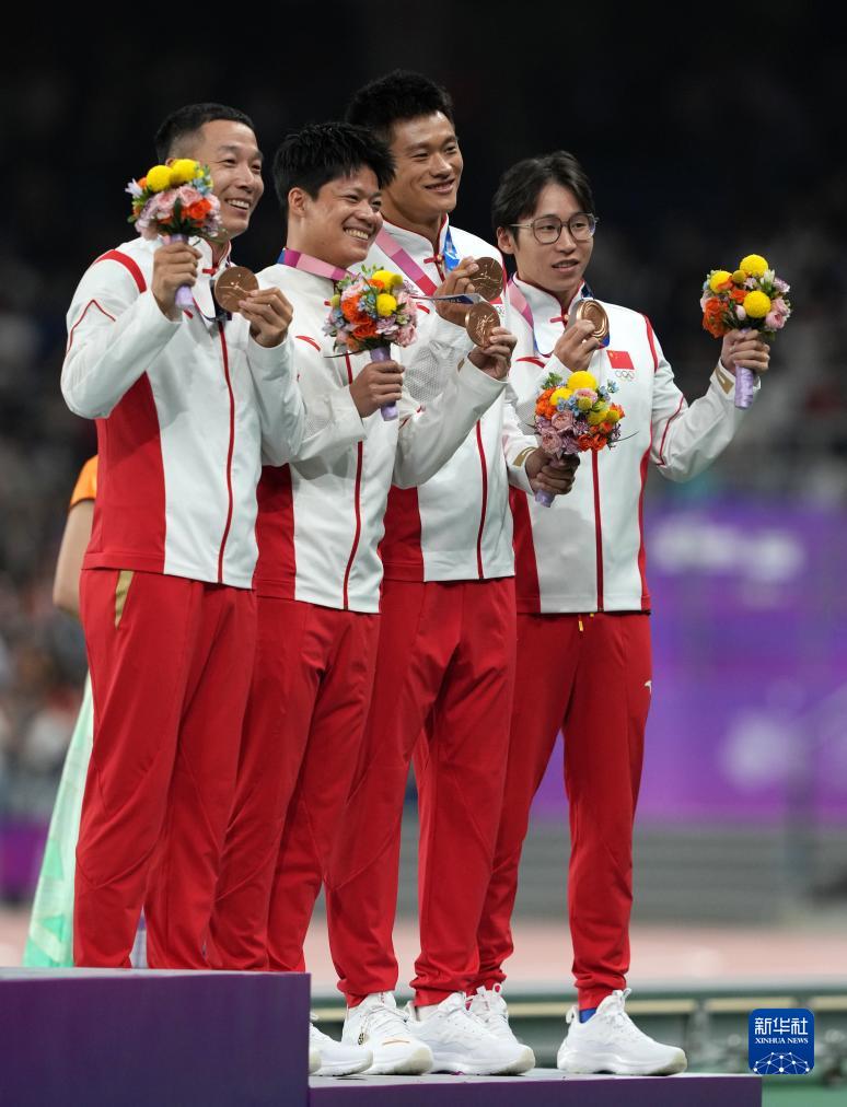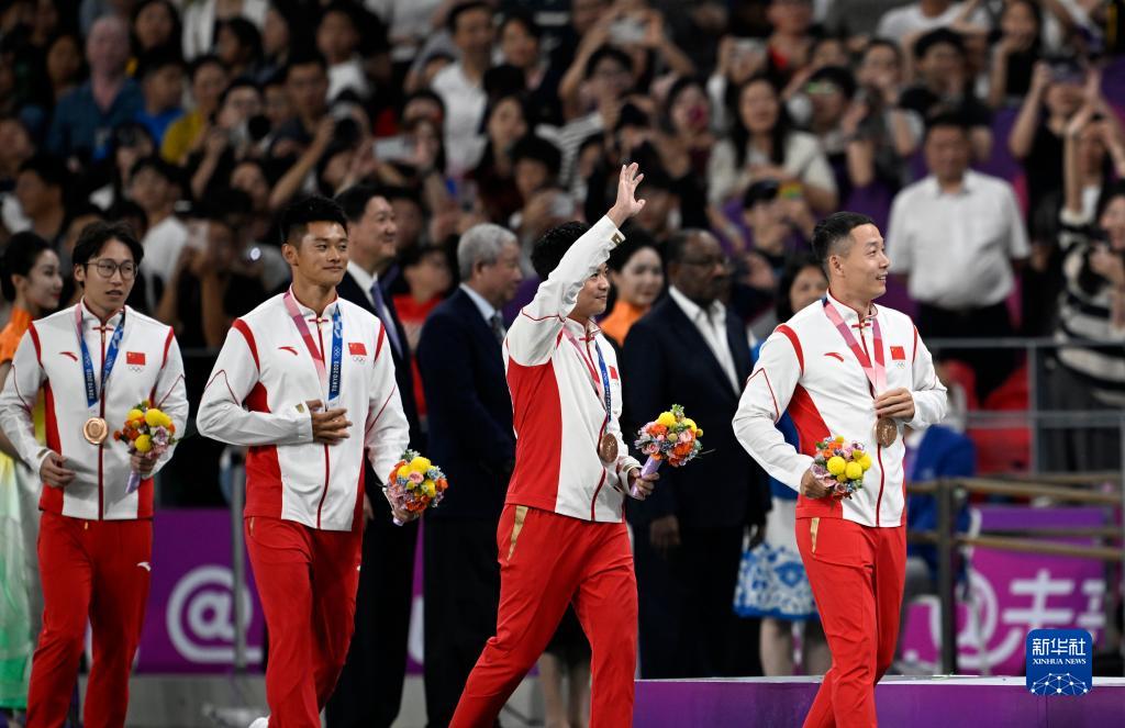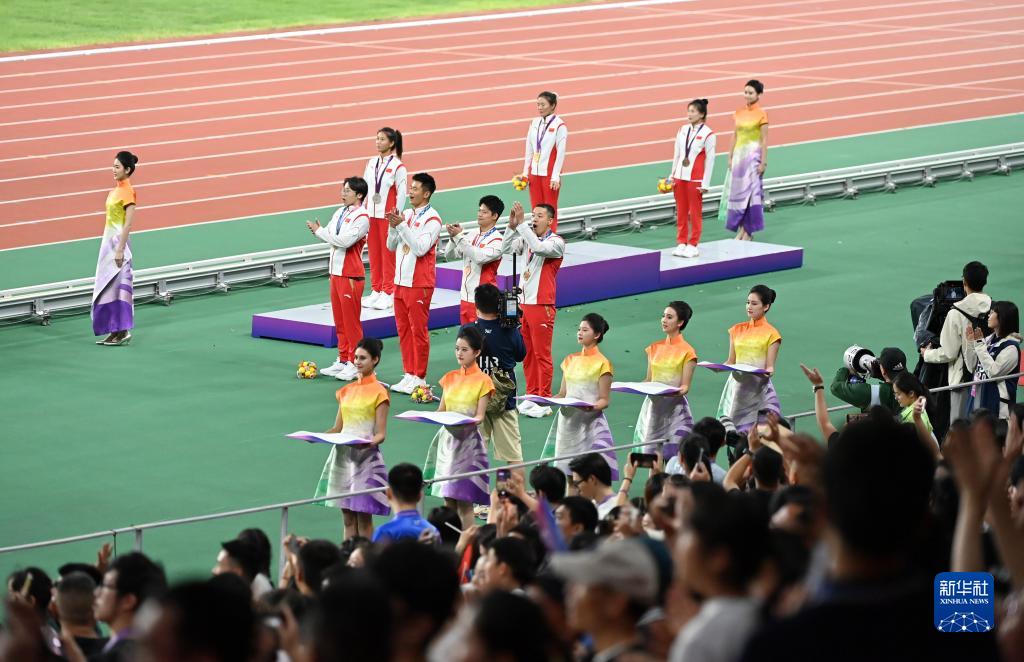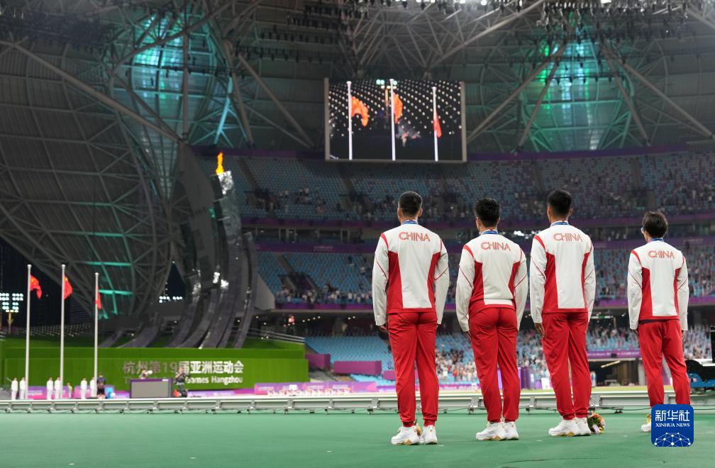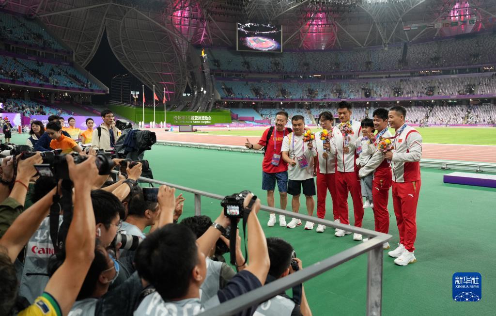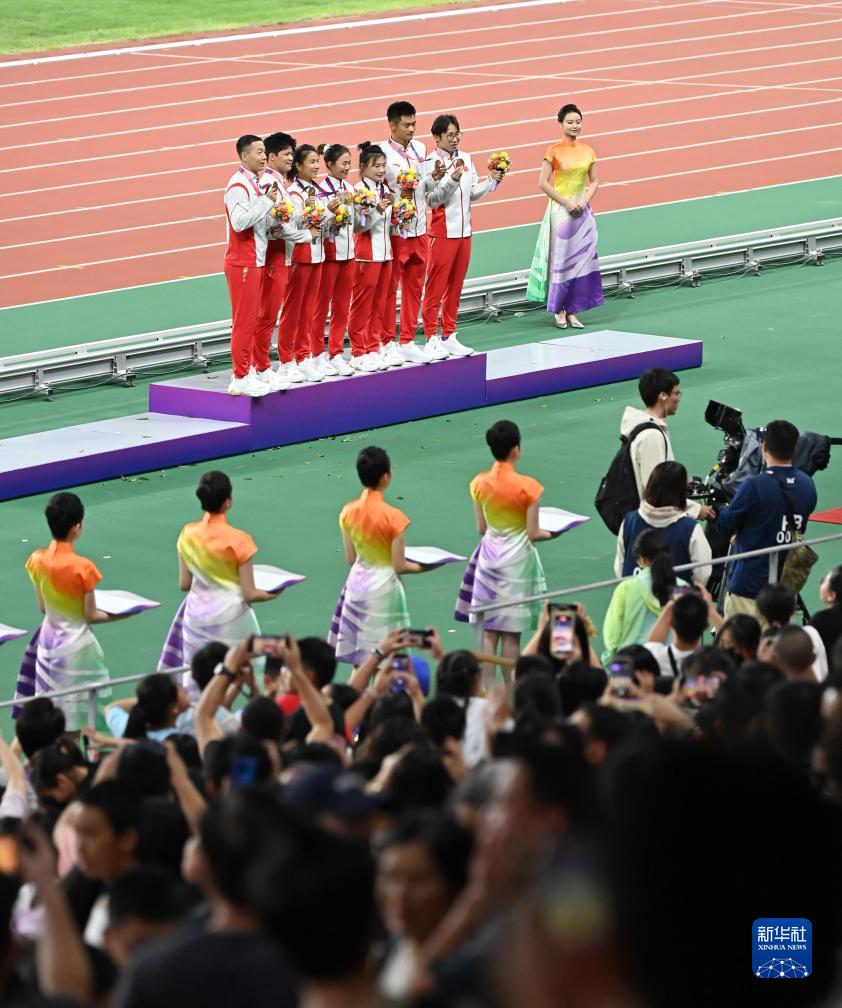 當晚,杭州亞運會田徑項目比賽結(jié)束后,中國奧委會在杭州奧體中心體育場舉行遞補奧運獎牌頒獎儀式,為遞補獲得東京奧運會男子4X100米接力銅牌的蘇炳添、謝震業(yè)、吳智強和湯星強與遞補獲得2012年倫敦奧運會女子20公里競走金、銀、銅牌的切陽什姐、劉虹、呂秀芝頒發(fā)獎牌。