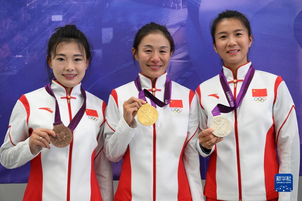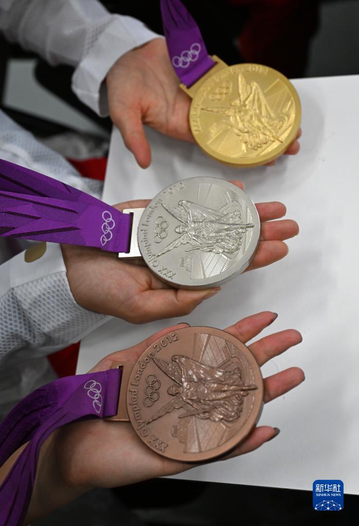這是切陽什姐、劉虹、呂秀芝遞補獲得的2012年倫敦奧運會女子20公里競走金、銀、銅牌(10月4日攝)。