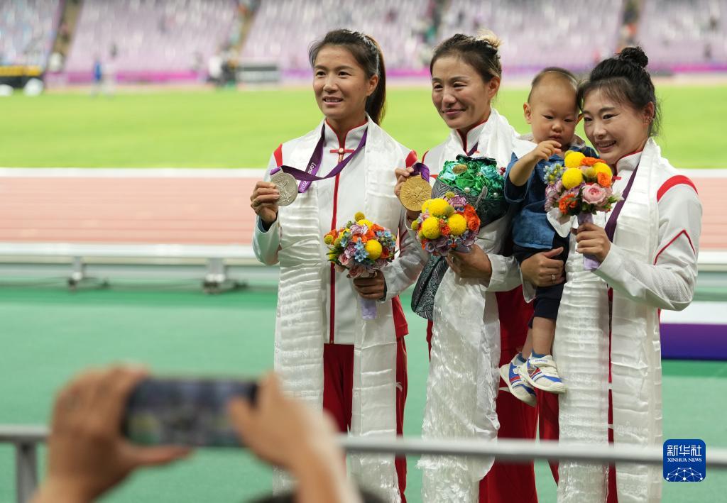10月4日,切陽什姐(中)、劉虹(右)、呂秀芝(左)在頒獎儀式后展示獎牌。