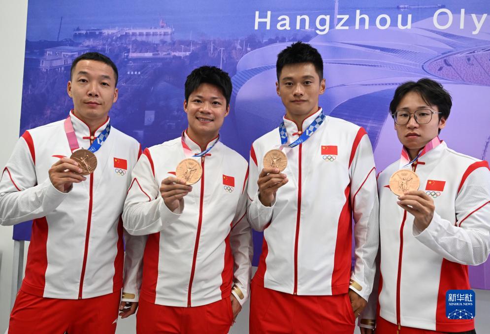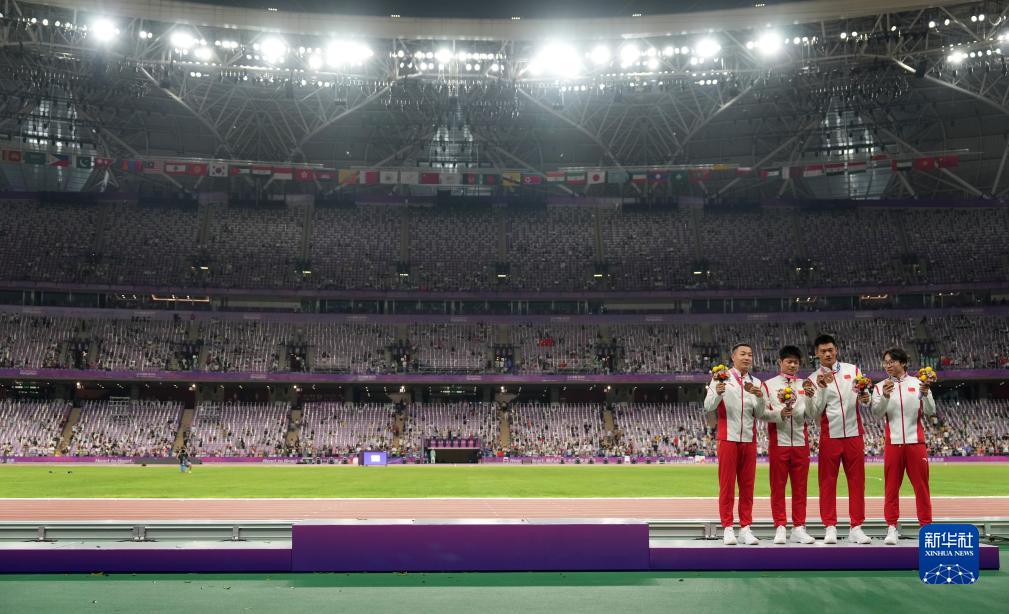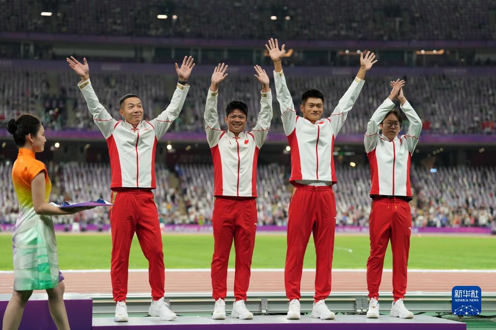 10月4日,湯星強、謝震業(yè)、蘇炳添、吳智強(從右至左)在頒獎儀式后展示獎牌。