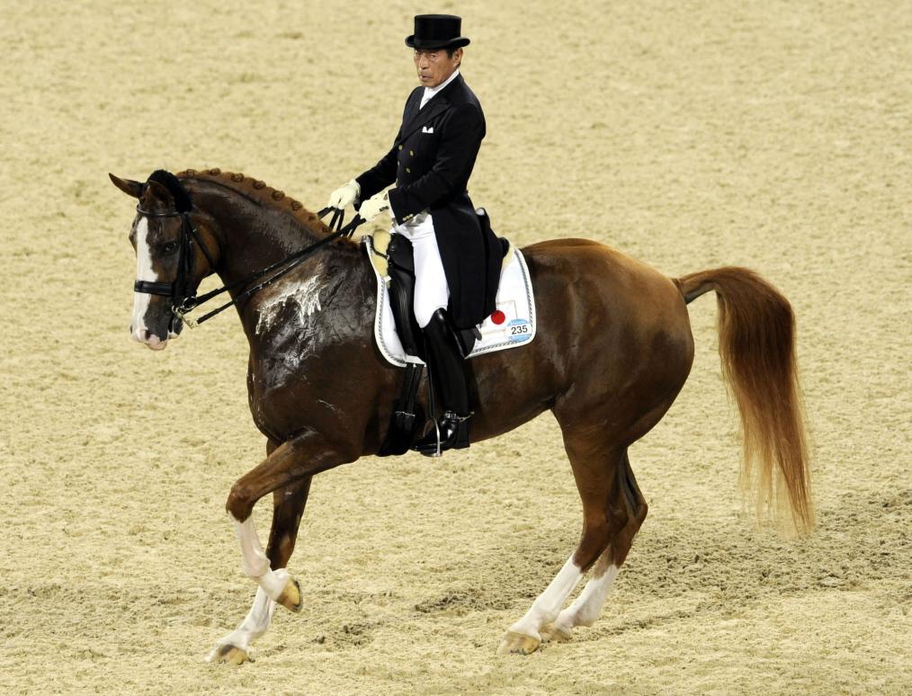 2008年8月14日,時(shí)年67歲的日本騎手法華津?qū)捲诒本W運(yùn)會(huì)比賽中。新華社記者呂小煒攝