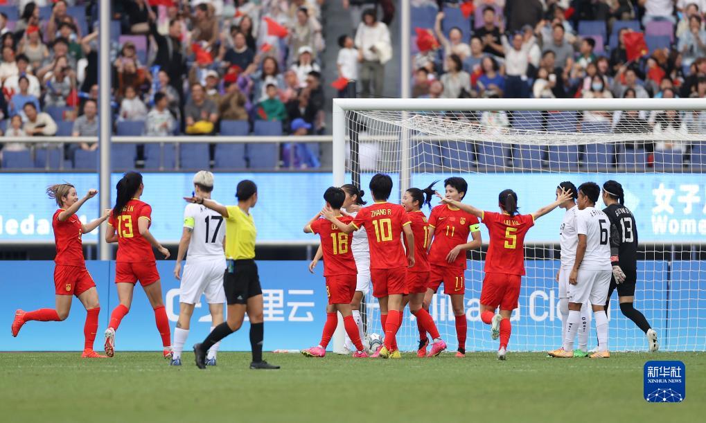 10月6日,中國隊球員在比賽中慶祝進球。新華社記者 賈浩成 攝