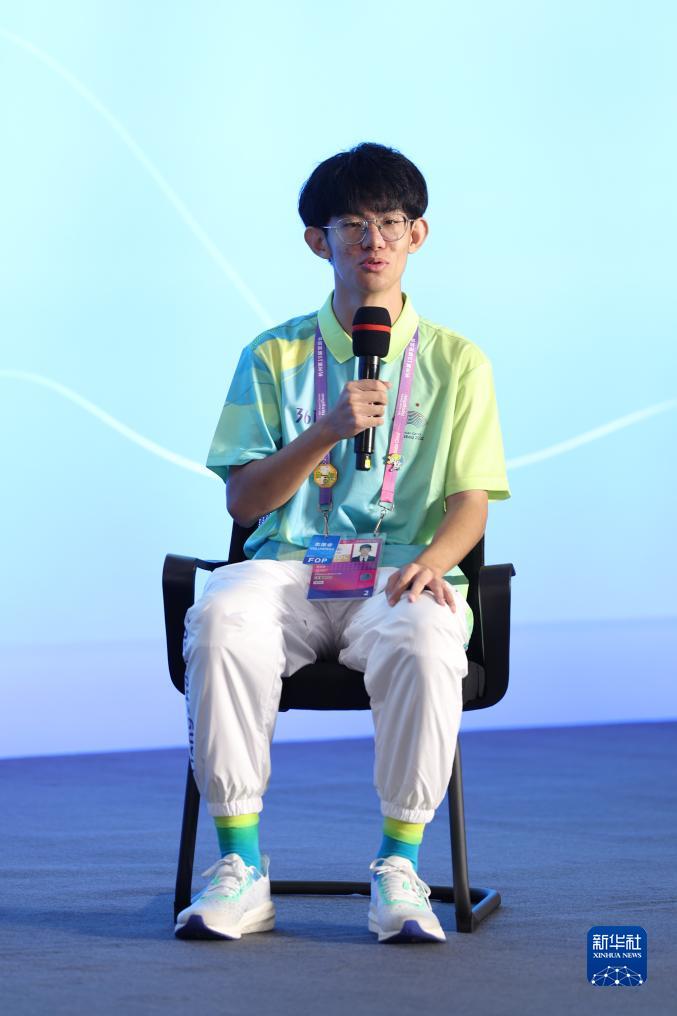 10月7日,杭州奧體中心籃球館競賽志愿者李冠霖在見面會現(xiàn)場發(fā)言。