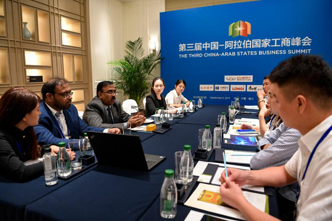 2019年9月5日,迪拜工商會代表與中方代表在第四屆中國-阿拉伯國家博覽會期間進行洽談。新華社記者馮開華攝