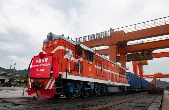 7月29日,滿載110個標箱出口貨物的X8020次中歐班列從鐵路義烏西站鳴笛啟程。新華社發(fā)(時寬兵攝)