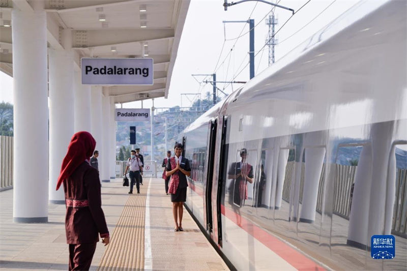 10月17日,在印度尼西亞雅加達哈利姆站,乘務人員在站臺歡迎乘客。新華社記者 徐欽 攝