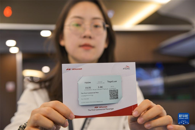10月17日,乘客在行駛中的雅萬高鐵高速動車組列車車廂內(nèi)展示紀念車票。新華社記者 徐欽 攝