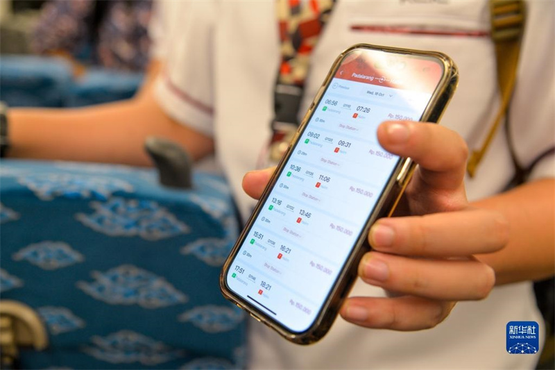 10月17日,一名乘客在行駛中的雅萬高鐵高速動車組列車車廂內(nèi)展示雅萬高鐵購票手機應用。新華社記者 徐欽 攝