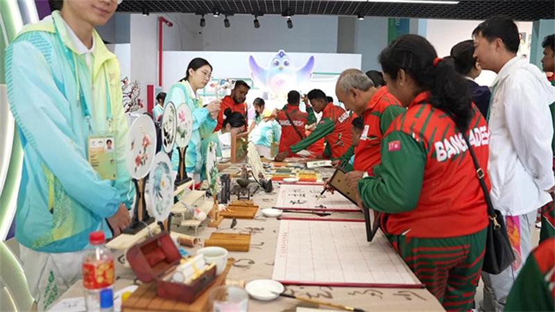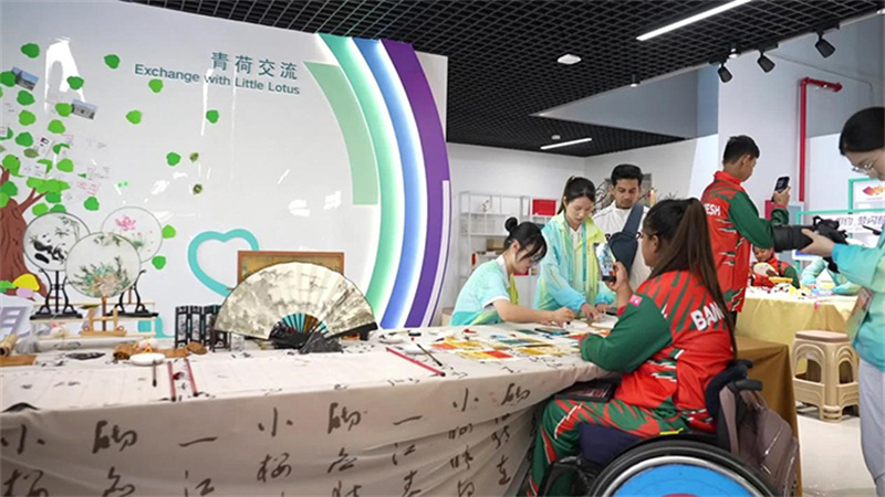 品嘗過(guò)美食,想要放松心情,志愿服務(wù)中心是個(gè)好去處。孟加拉國(guó)代表團(tuán)的運(yùn)動(dòng)員們,正在“小青荷”的引導(dǎo)下參觀志愿服務(wù)文化展、體驗(yàn)各類互動(dòng)活動(dòng)。