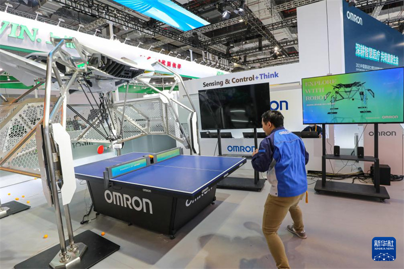 11月2日,工作人員在歐姆龍展位測試乒乓球教練機(jī)器人。