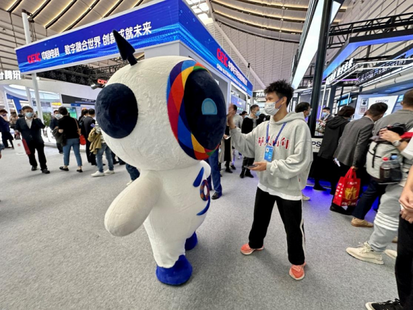 2022年11月9日,互聯(lián)網(wǎng)之光博覽會(huì)現(xiàn)場(chǎng),大會(huì)吉祥物“小互”在與觀眾互動(dòng)
