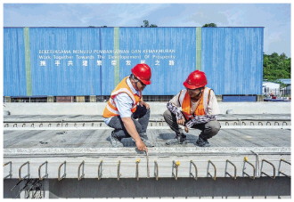 中馬共建“一帶一路”的標(biāo)志性項(xiàng)目——馬來(lái)西亞?wèn)|海岸鐵路(馬東鐵)建設(shè)如火如荼。圖為2023年4月26日,在馬來(lái)西亞吉蘭丹州的馬東鐵項(xiàng)目一分部制梁場(chǎng),技術(shù)主管鄧友志(右)和馬來(lái)西亞本地青年員工鄧德緯討論生產(chǎn)情況。 新華社記者 朱煒 攝