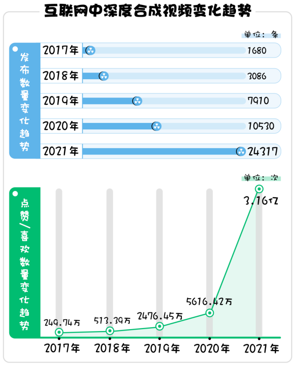上一次人們感嘆人工智能的強(qiáng)大,還要追溯到2016年,阿爾法圍棋(AlphaGo)成為了第一個(gè)擊敗圍棋世界冠軍的人工智能機(jī)器人,深度學(xué)習(xí)的威力開(kāi)始顯現(xiàn)。在此后的幾年,深度合成技術(shù)被廣泛應(yīng)用于各個(gè)領(lǐng)域。以互聯(lián)網(wǎng)中深度合成視頻為例,根據(jù)清華大學(xué)人工智能研究院聯(lián)合多家單位發(fā)布的《深度合成十大趨勢(shì)報(bào)告(2022)》顯示,近幾年,互聯(lián)網(wǎng)中深度合成視頻的發(fā)布與傳播數(shù)量呈現(xiàn)高速增長(zhǎng)的態(tài)勢(shì)。