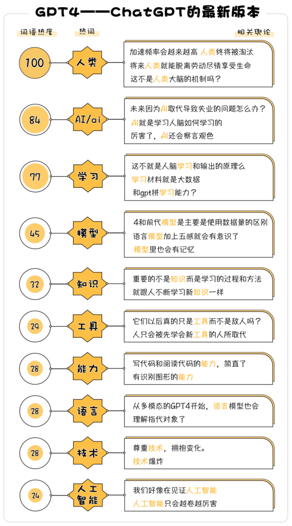 (制作:法治網(wǎng)輿情中心 數(shù)據(jù)來(lái)源:在嗶哩嗶哩一則關(guān)于“GPT4會(huì)顛覆現(xiàn)有工作流”的視頻中,選取超過(guò)10000條彈幕及一級(jí)評(píng)論,對(duì)所選數(shù)據(jù)進(jìn)行NLP分析,將出現(xiàn)次數(shù)最多的詞語(yǔ)規(guī)定為100,以該詞語(yǔ)為基準(zhǔn)對(duì)其他熱詞進(jìn)行等尺度放縮,并選取每個(gè)熱詞對(duì)應(yīng)的輿論做可視化分析)