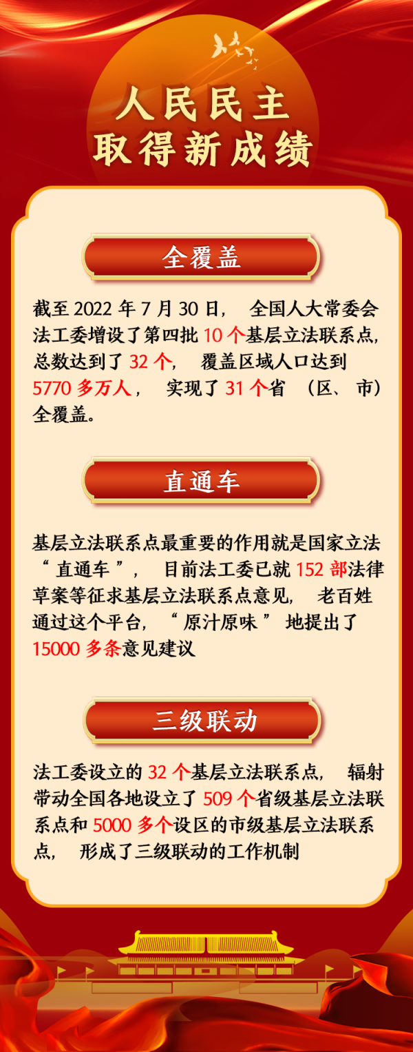 截至2022年7月30日,全國(guó)人大常委會(huì)法工委增設(shè)了第四批10個(gè)基層立法聯(lián)系點(diǎn),總數(shù)達(dá)到了32個(gè),實(shí)現(xiàn)了31個(gè)?。▍^(qū)、市)全覆蓋。32個(gè)基層立法聯(lián)系點(diǎn)覆蓋區(qū)域人口達(dá)到5770多萬(wàn)人,越來(lái)越多的老百姓在家門口就能對(duì)關(guān)切的法律問(wèn)題發(fā)表意見、表達(dá)訴求。