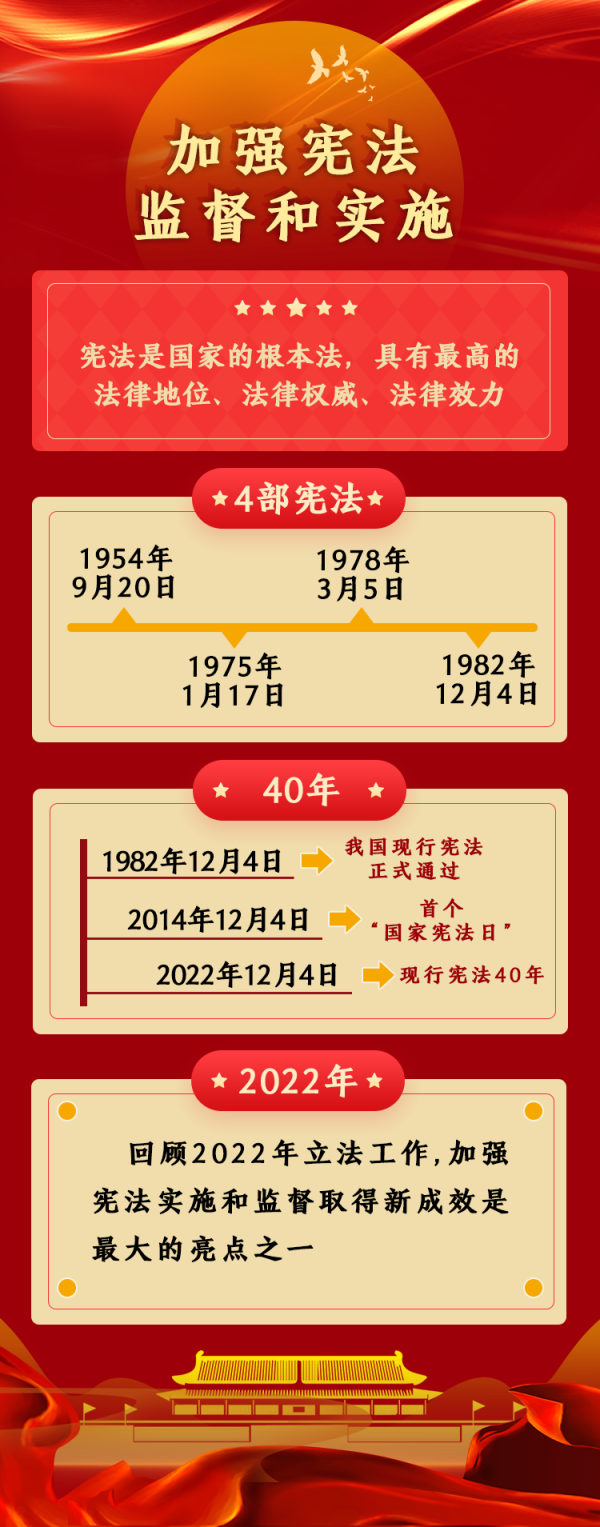 2022年是我國(guó)現(xiàn)行憲法公布施行40周年。這40年,也是我國(guó)改革開放深入推進(jìn)、經(jīng)濟(jì)社會(huì)迅速發(fā)展、人民生活水平不斷提高的40年?;仡?022年立法工作,加強(qiáng)憲法實(shí)施和監(jiān)督取得新成效是最大的亮點(diǎn)之一。具體包括,不斷健全保證憲法全面實(shí)施的制度體系,通過(guò)完備的法律保證憲法實(shí)施,嚴(yán)格落實(shí)合憲性審查制度機(jī)制,深入推進(jìn)合憲性審查工作,更好發(fā)揮憲法在治國(guó)理政中的重要作用,維護(hù)憲法權(quán)威和尊嚴(yán)。