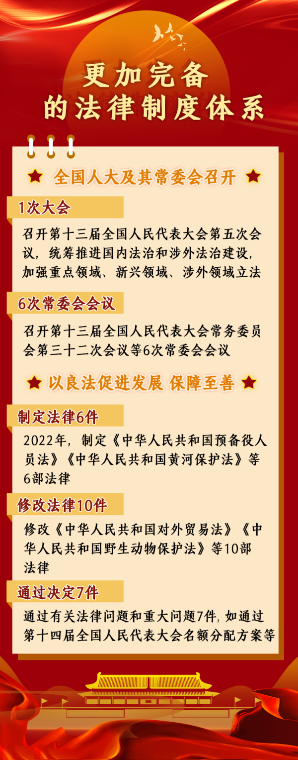 據(jù)統(tǒng)計(jì),2022年,全國(guó)人大及其常委會(huì)召開了1次大會(huì)和6次常委會(huì)會(huì)議,統(tǒng)籌推進(jìn)國(guó)內(nèi)法治和涉外法治建設(shè),加強(qiáng)重點(diǎn)領(lǐng)域、新興領(lǐng)域、涉外領(lǐng)域立法,制定法律6件,修改法律10件次,作出法律解釋1件,通過(guò)有關(guān)法律問(wèn)題和重大問(wèn)題決定7件,法律制度體系更加完備。