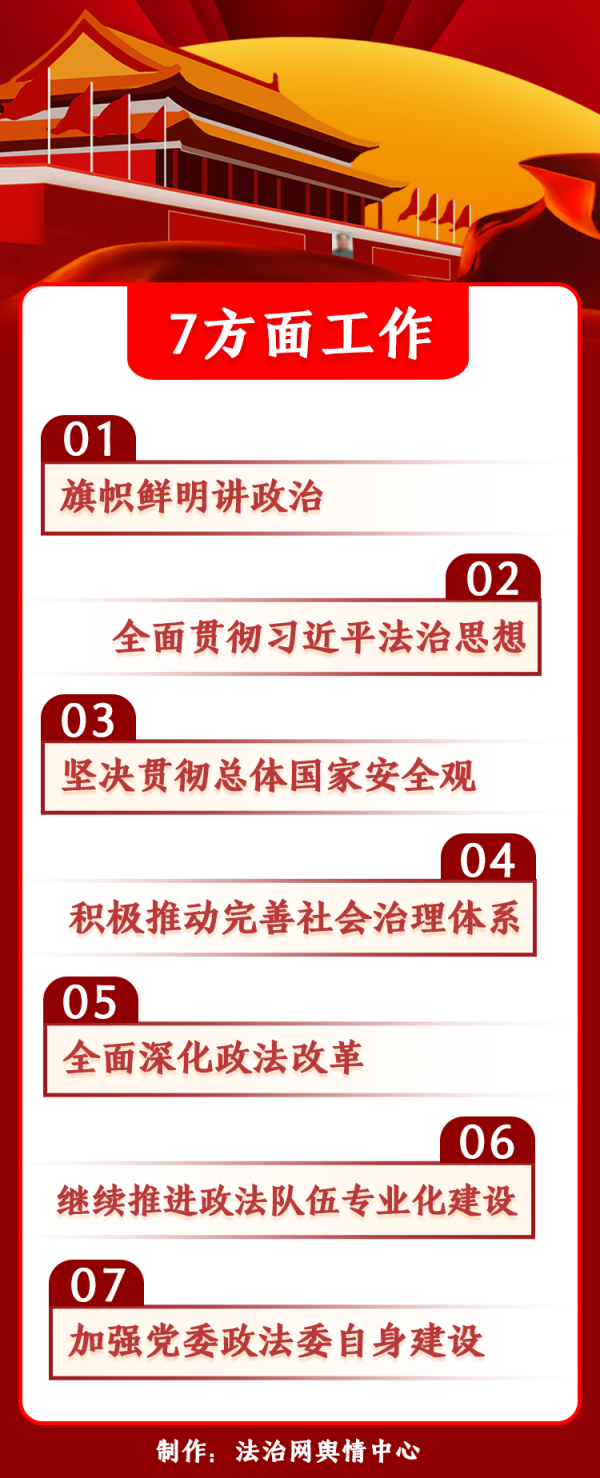 會議要求抓好七方面工作:旗幟鮮明講政治;全面貫徹習近平法治思想;堅決貫徹總體國家安全觀;積極推動完善社會治理體系;全面深化政法改革;持續(xù)推進政法隊伍專業(yè)化建設(shè);加強黨委政法委自身建設(shè)。