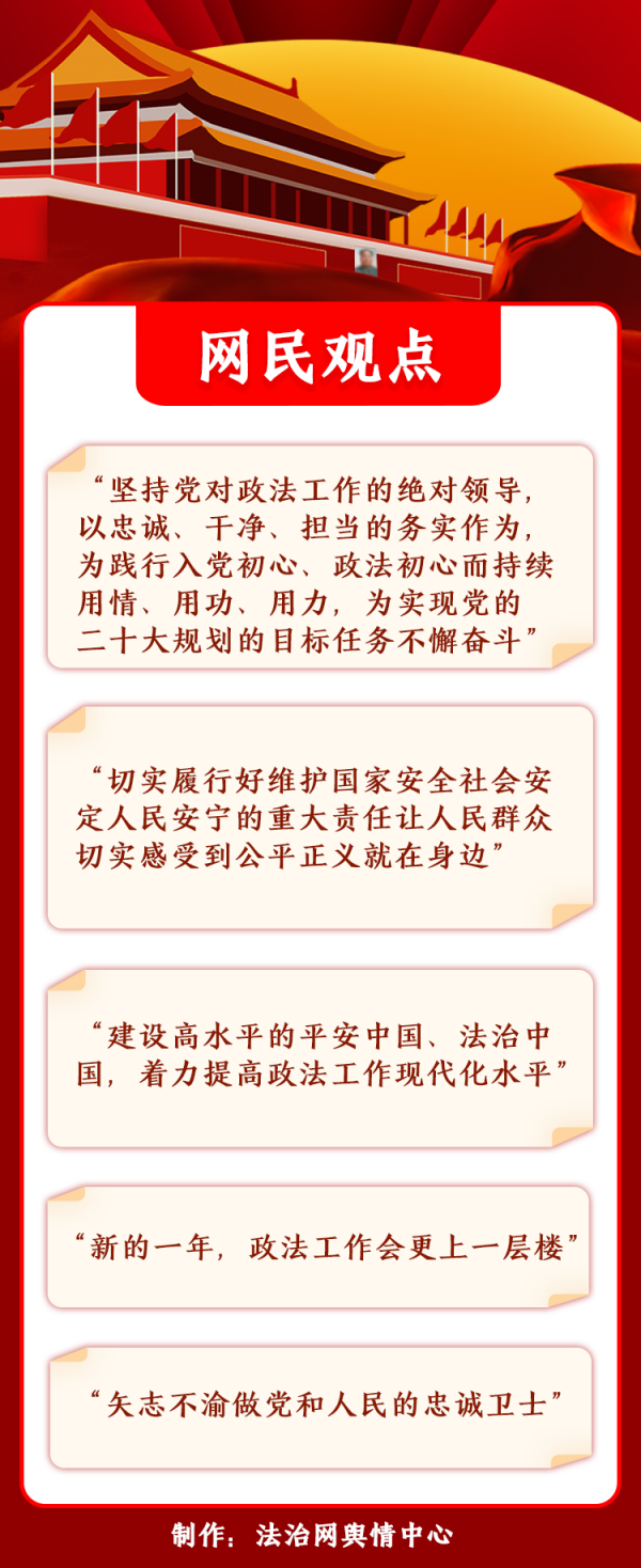 網(wǎng)民期待開啟新時代政法工作發(fā)展新篇章。不少網(wǎng)民在“中央政法委長安劍”等政法機關(guān)官微留言,認為會議對政法工作的重要部署句句關(guān)于公正、深入人心。多數(shù)網(wǎng)民對全國政法機關(guān)有效維護國家安全、社會安定、人民安寧的付出表示感謝,期待推進建設(shè)更高水平的平安中國、法治中國;部分網(wǎng)民向守護公平正義、維護社會穩(wěn)定而犧牲的政法干警致敬;少數(shù)網(wǎng)民結(jié)合政法系統(tǒng)違紀違法典型案例,呼吁在從嚴正風肅紀上緊抓不放,建設(shè)高素質(zhì)政法鐵軍。