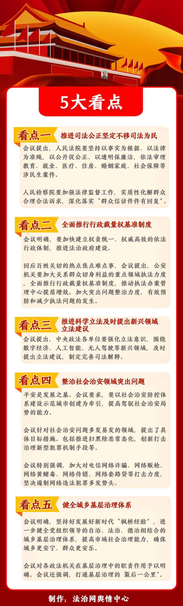 根據(jù)新華網(wǎng)發(fā)布的文章,本次會議聚焦2023年政法工作五大看點:推進公正司法,堅定不移司法為民;全面推行行政裁量權(quán)基準制度;推進科學立法及時提出新興領(lǐng)域立法建議;整治社會治安領(lǐng)域突出問題;健全城鄉(xiāng)基層治理體系。