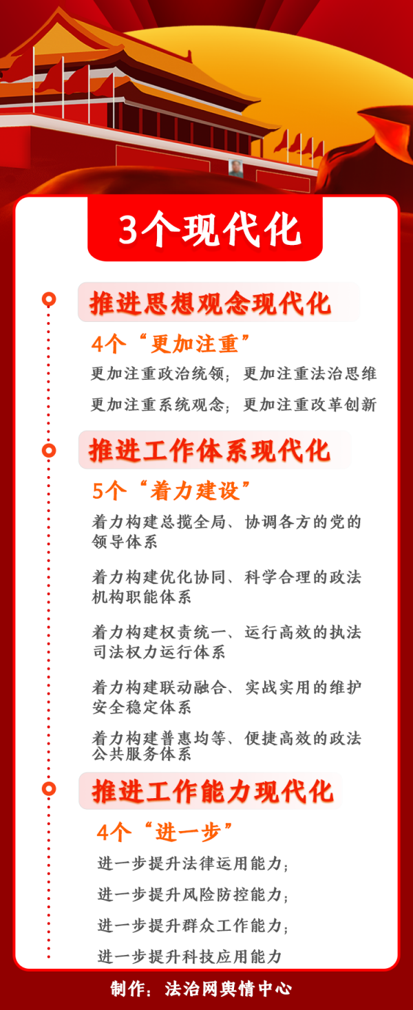 據(jù)法治網(wǎng)報道,本次會議提出要推進政法工作三個現(xiàn)代化:推進思想觀念現(xiàn)代化;推進工作體系現(xiàn)代化;推進工作能力現(xiàn)代化。