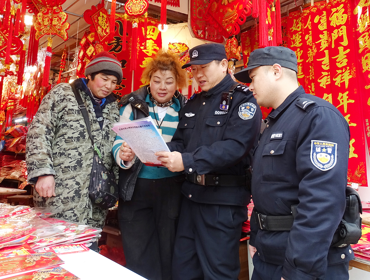 1月17日,安徽省蕪湖市公安局鏡湖分局濱江派出所民輔警在轄區(qū)年貨市場走訪群眾并宣傳安全防范知識,提高大家的安全防范意識。