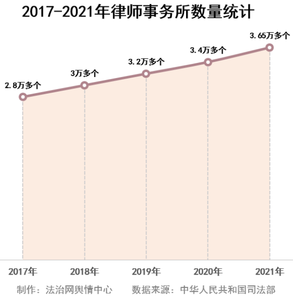 2017年至2021年,律師事務(wù)所數(shù)量穩(wěn)步增加。截至2021年底,全國共有律師事務(wù)所3.65萬多家。其中,合伙所2.61萬多家,占比71.64%;個人所9600多家,占比26.33%;國資所740多家,占比2.03%。