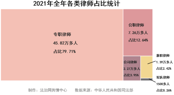 律師隊伍中,大體分為五類:專職律師、公職律師、公司律師、兼職律師、軍隊律師。截至2021年底,專職律師占比最高,達79.71%。公職律師、公司律師、兼職律師、軍隊律師分別占比12.64%、3.95%、2.42%和0.26%。