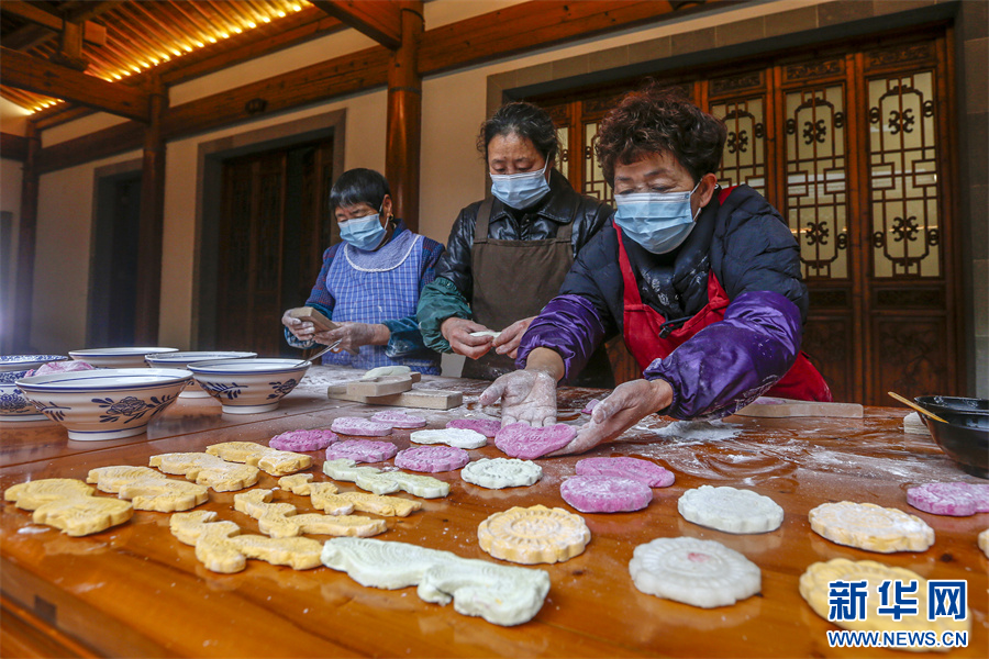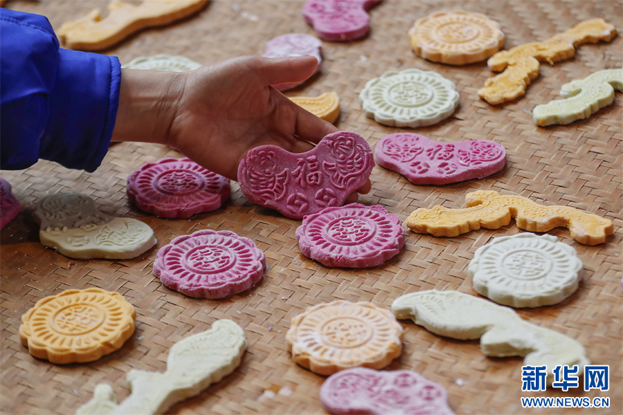 1月18日,在安徽省黃山市徽州區(qū)潛口鎮(zhèn)潛口村,村民用模具制作的多彩徽州米粿。